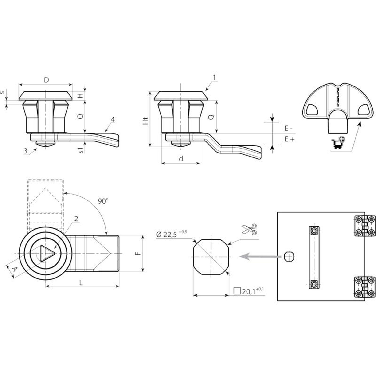 | Code | Art. | A | d | D | L | Q | E | F | Ht | H | s (max.) | s1 | Weight (g) | Key |
