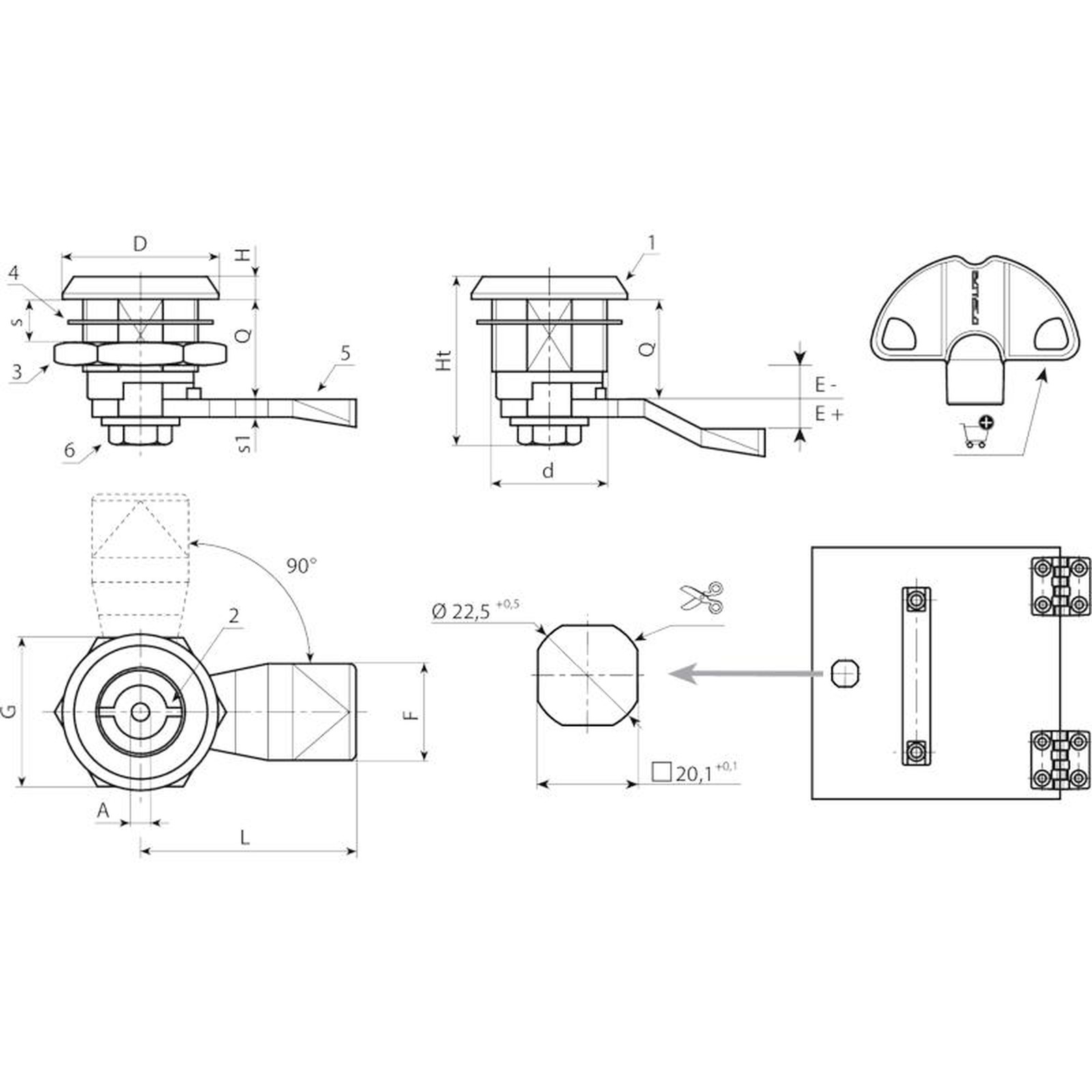 | Code | Art. | A | d | D | L | Q | E | F | G | Ht | H | s (max.) | s1 | Weight (g) | Key |