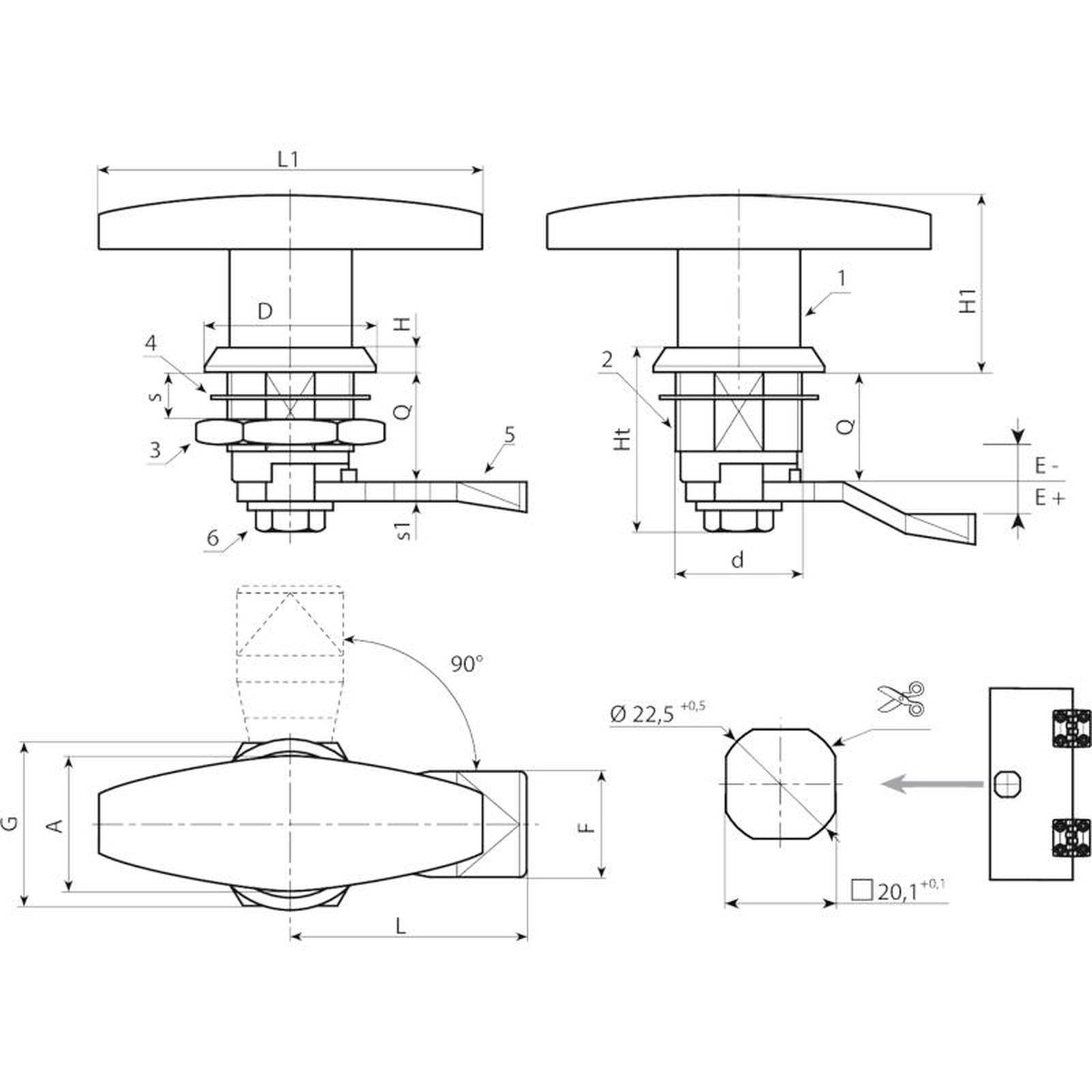 | Code | Art. | d | Q | L1 | L | E | F | D | A | G | H1 | Ht | H | H1 | s (max.) | s1 | Weight (g) |