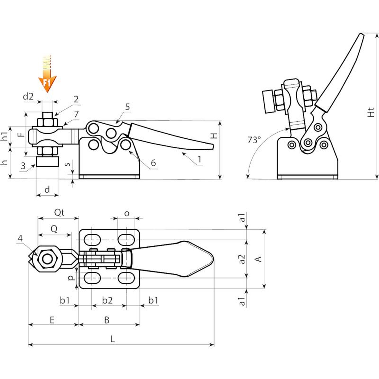 | Code | art. | h | L | A | B | E | F | H | Ht | Q | Qt | d | d2 | o | p | a1 | a2 | b1 | b2 | h1 | s | F1 (Kg) | Weight (g) |