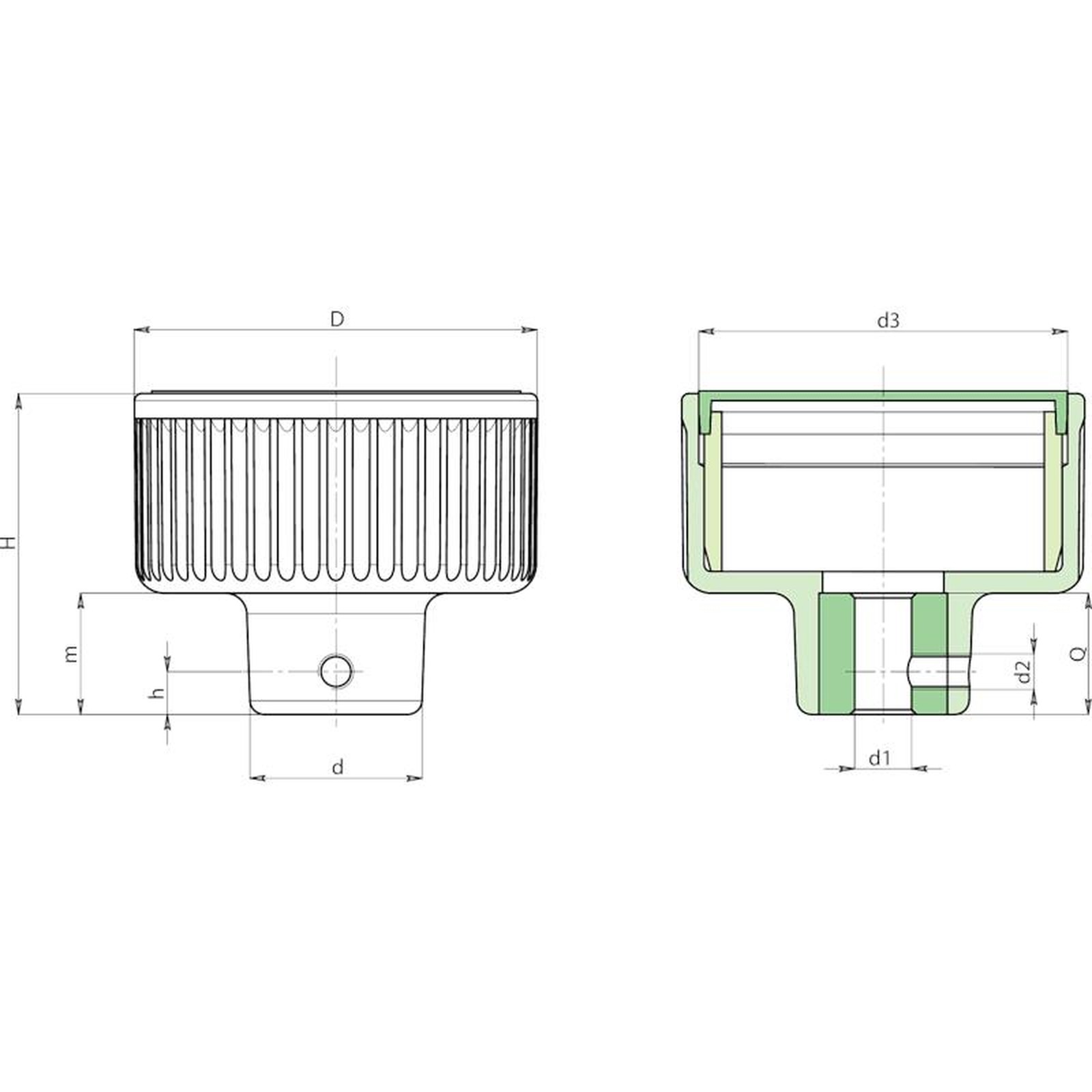 | Code | art. | D | d | H | m | h | d2 | d3 | dm | d1 6H | Q | Weight (g) |