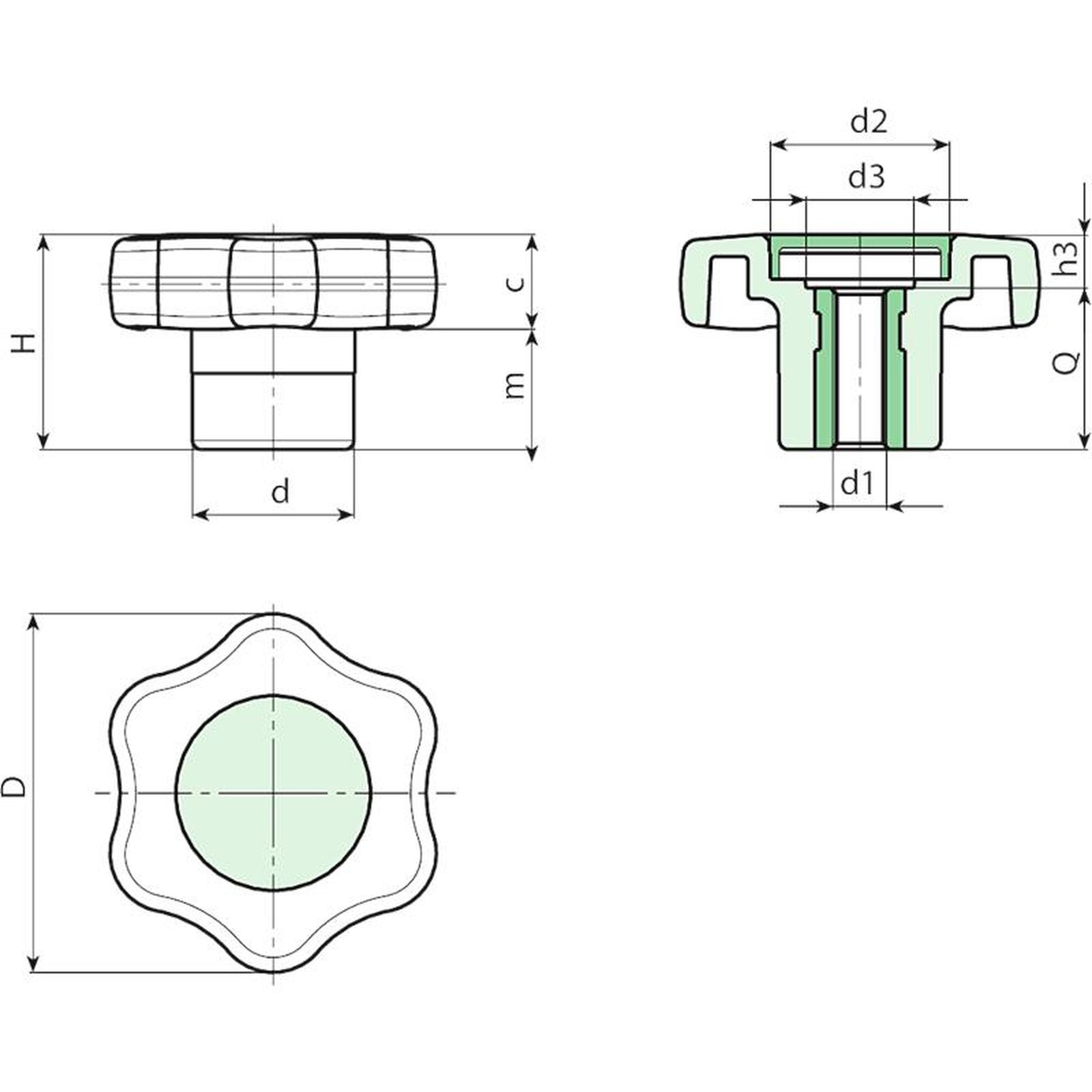 | Code | art. | D | H | d | c | m | d2 | d3 | h3 | d1 6H | Q | Weight (g) |