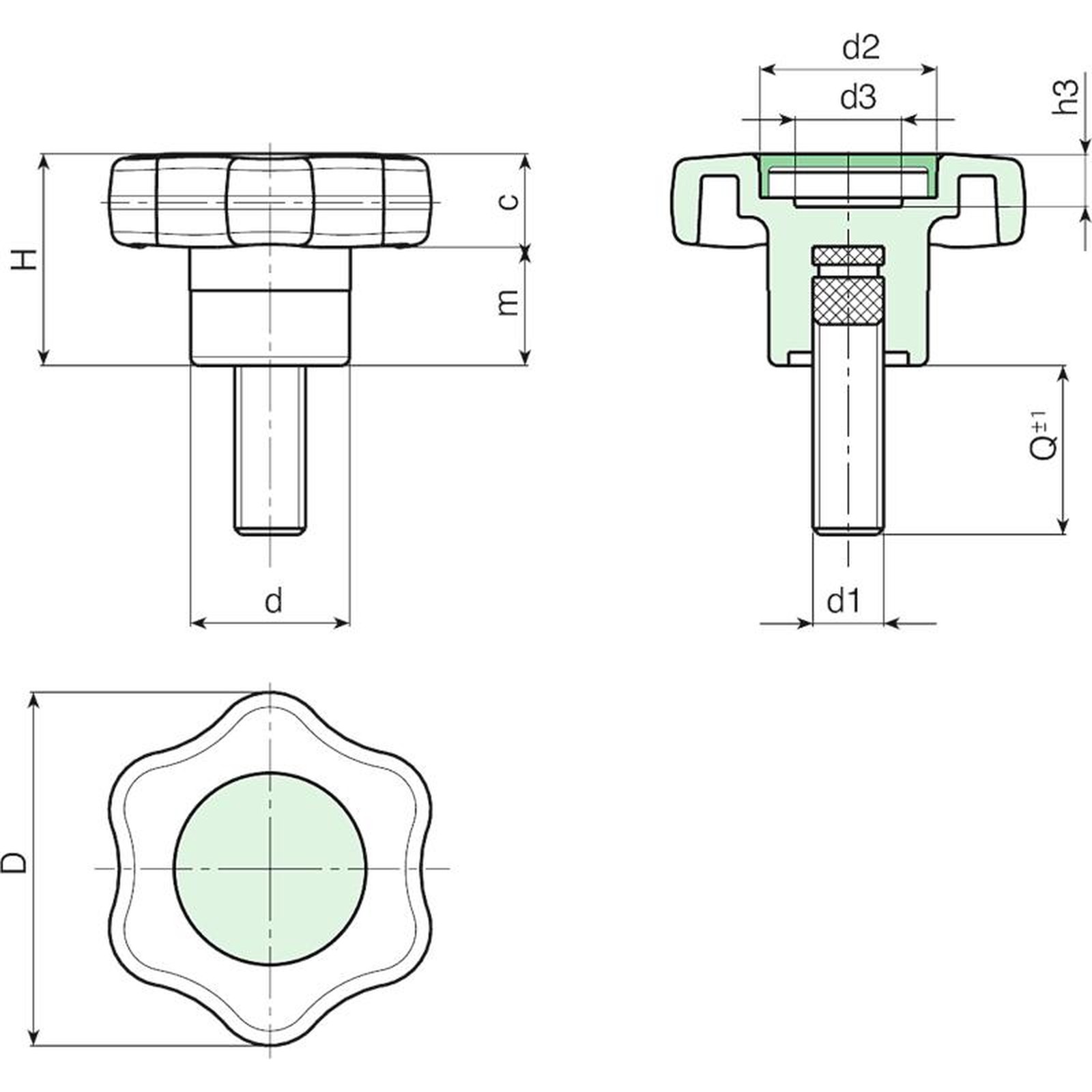 | Code | art. | D | H | d | c | m | d2 | d3 | h3 | d1 6g | Q | Weight (g) |