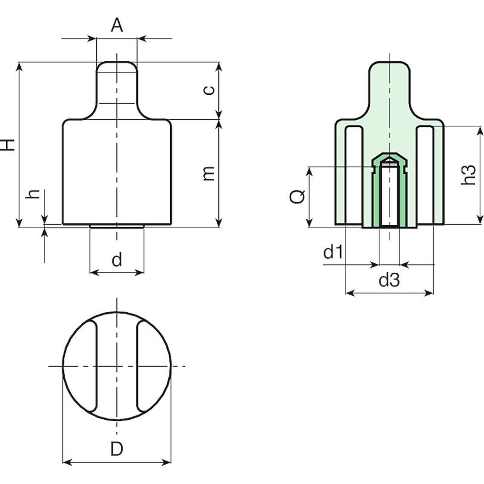 | Code | art. | D | H | d | A | c | m | h | h3 | d3 | d1 6H | Q | Weight (g) |