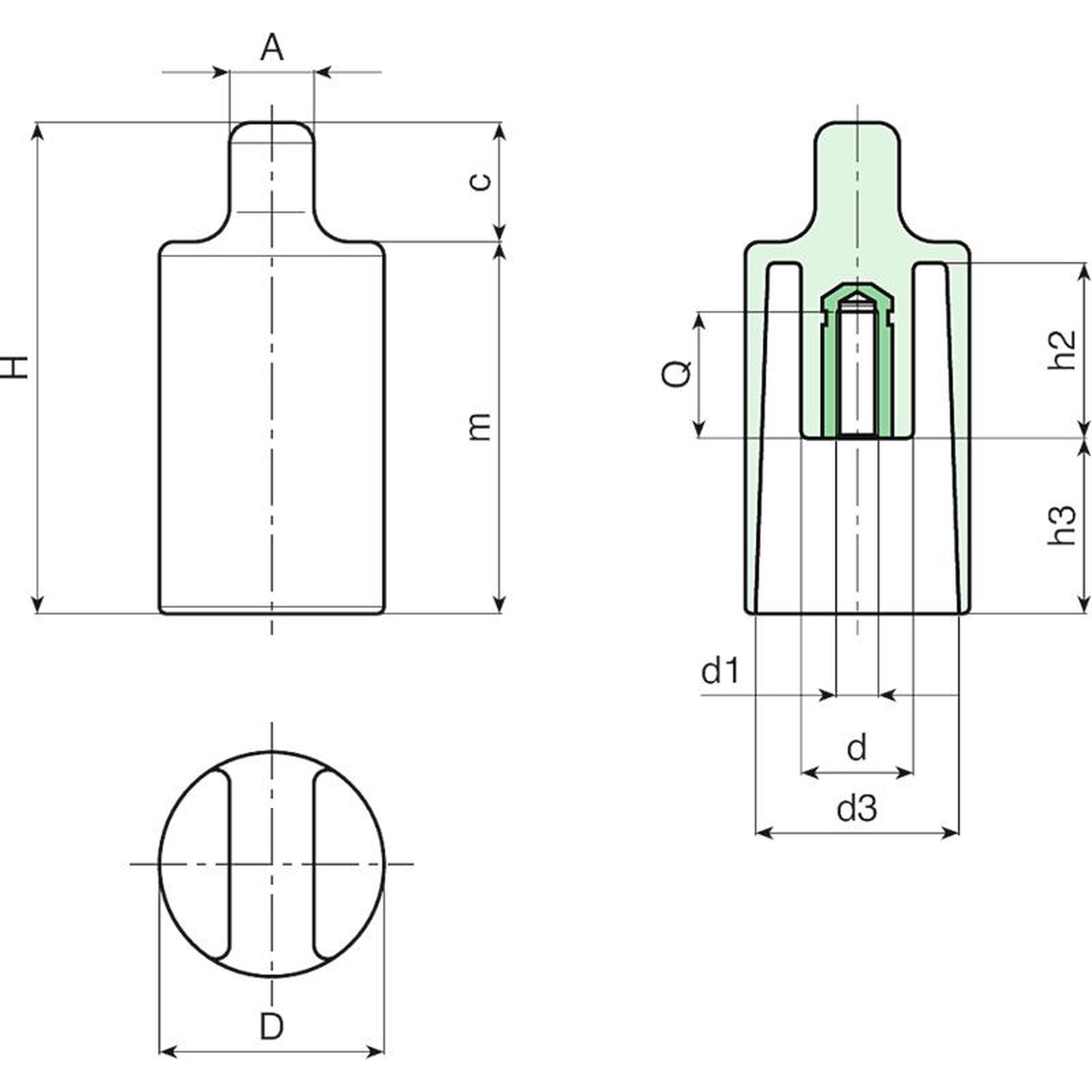 | Code | art. | D | H | d | A | c | m | h2 | h3 | d3 | d1 6H | Q | Weight (g) |