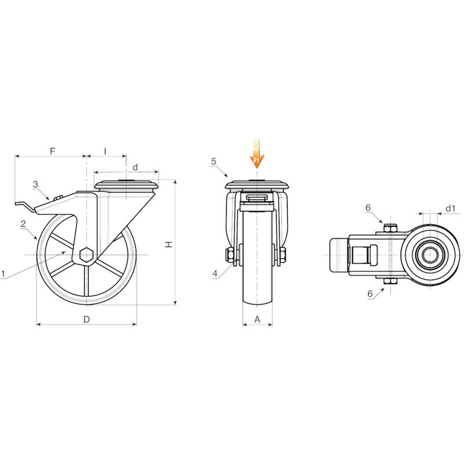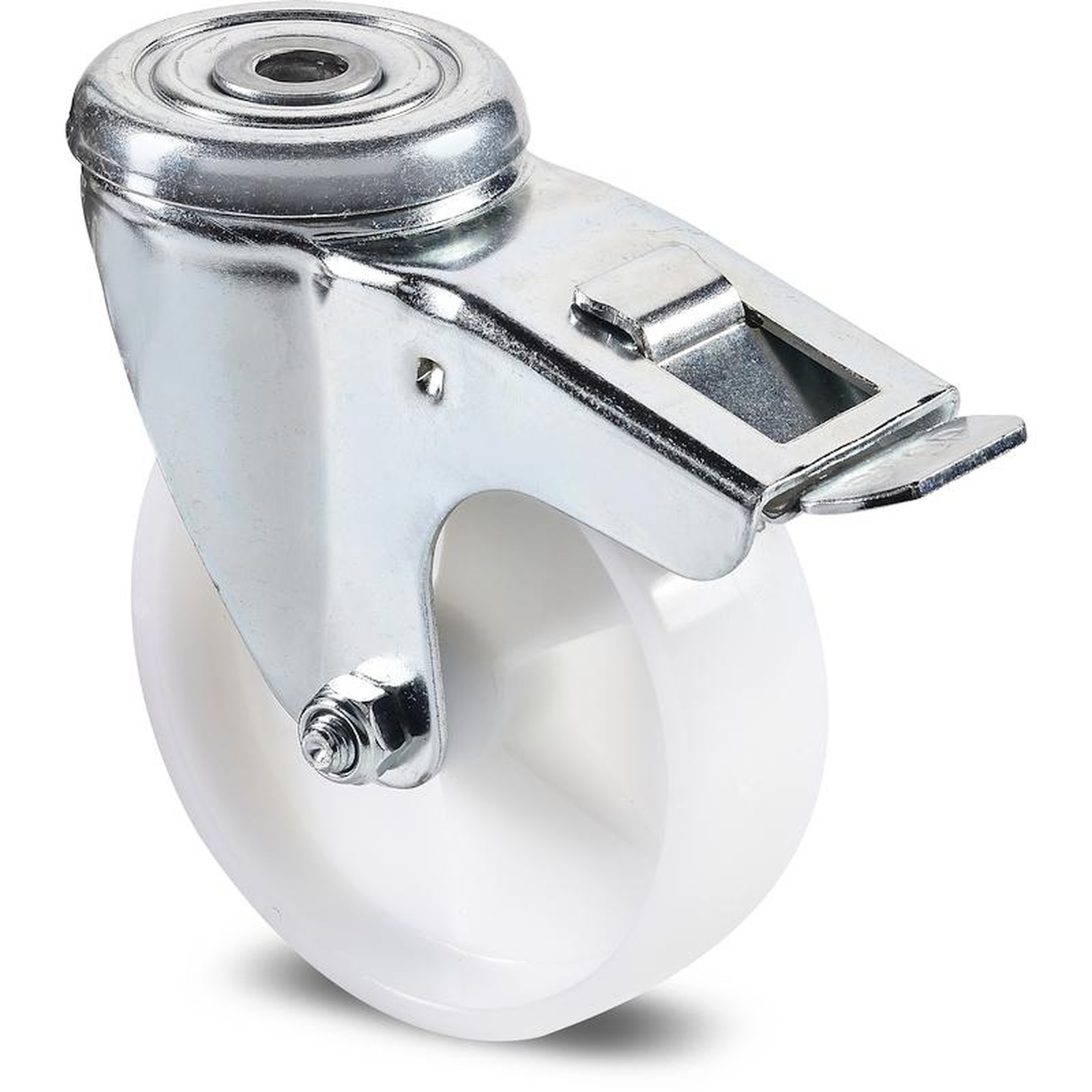 POLYAMIDE MONOLITHIC WHEEL WITH ROUND STEEL SWIVEL SUPPORT AND SMOOTH THROUGH HOLE WITH BRAKE