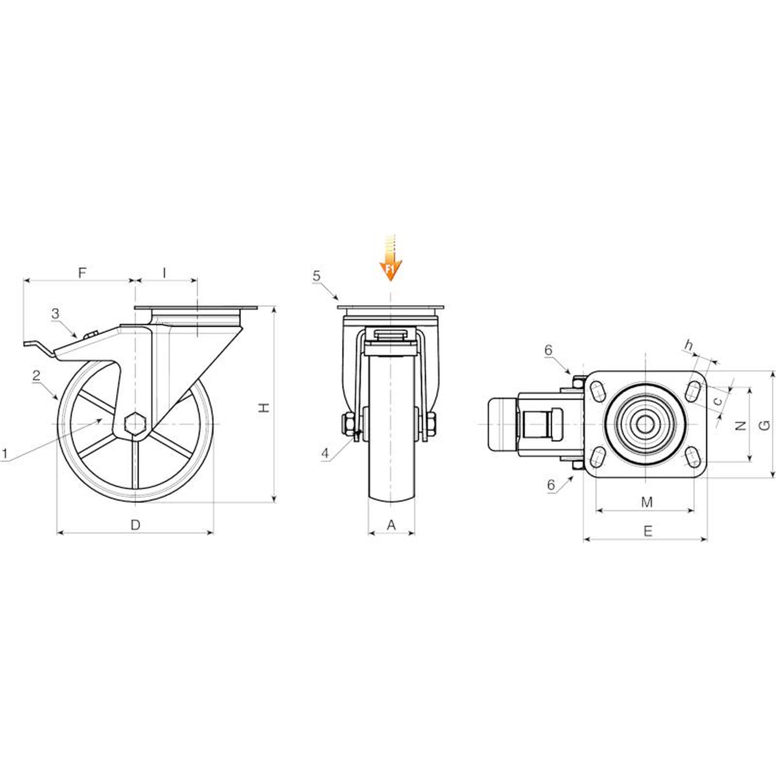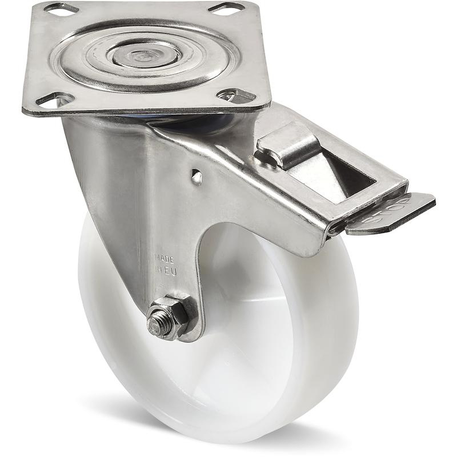 POLYAMIDE MONOLITHIC WHEEL WITH RECTANGULAR STAINLESS STEEL SWIVEL PLATE WITH BRAKE