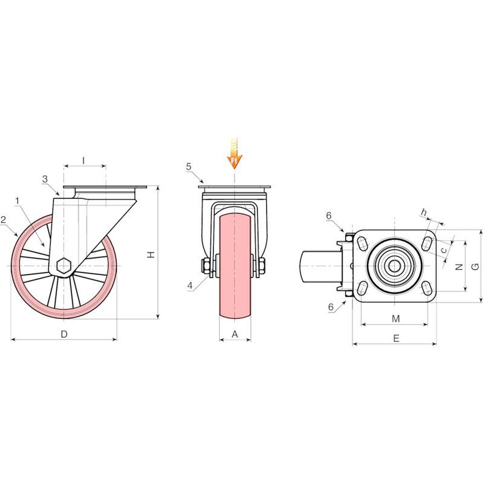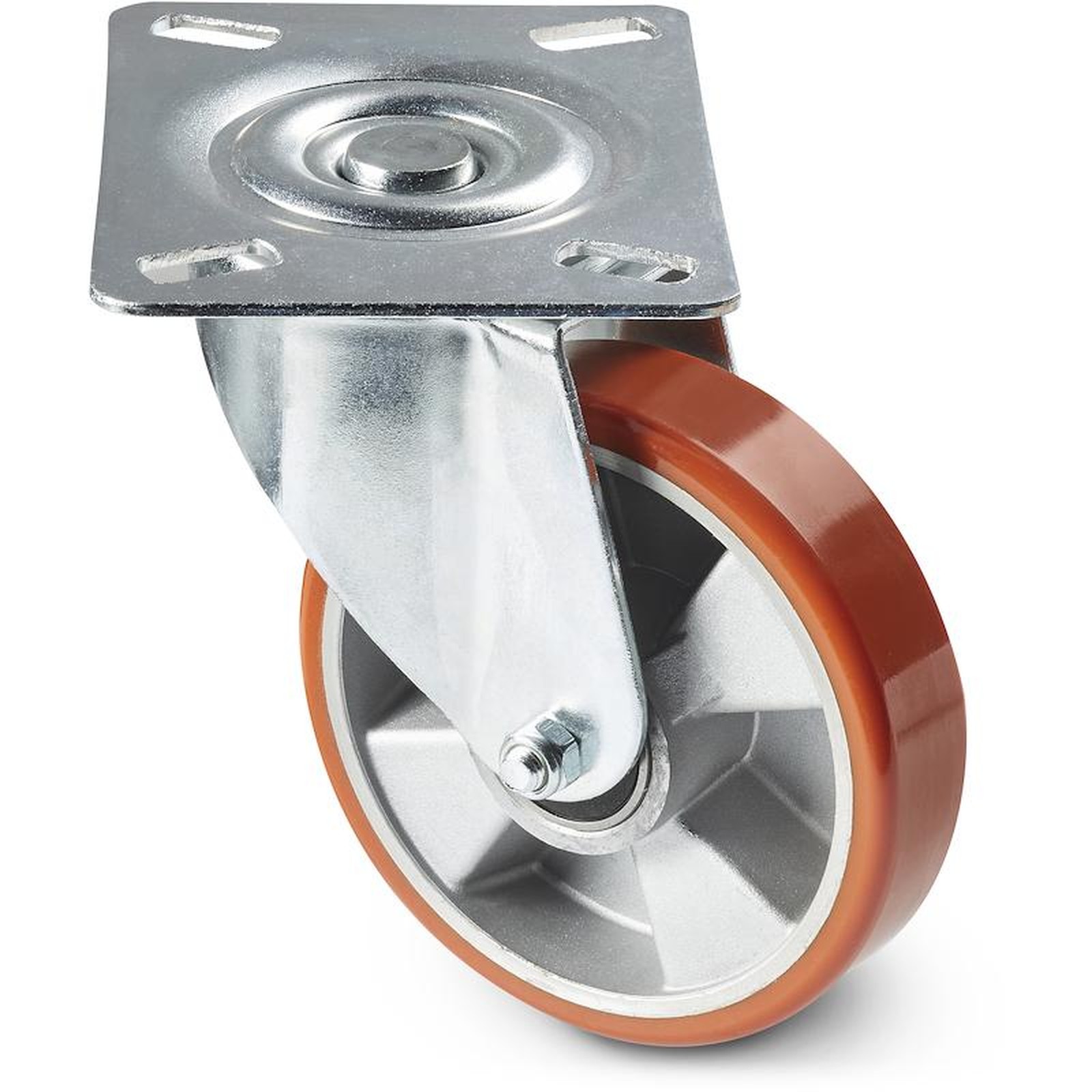ALUMINIUM / POLYURETHANE WHEEL WITH RECTANGULAR SWIVEL PLATE AND STEEL BEARINGS