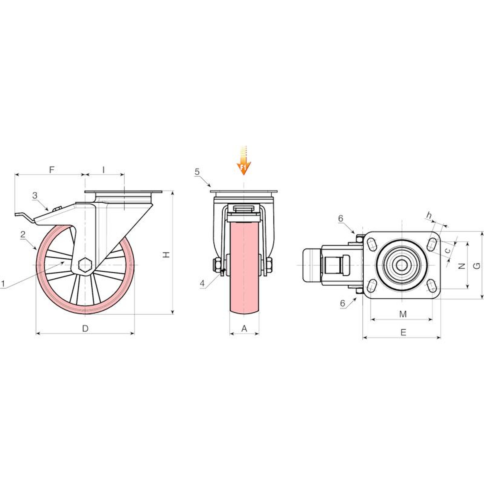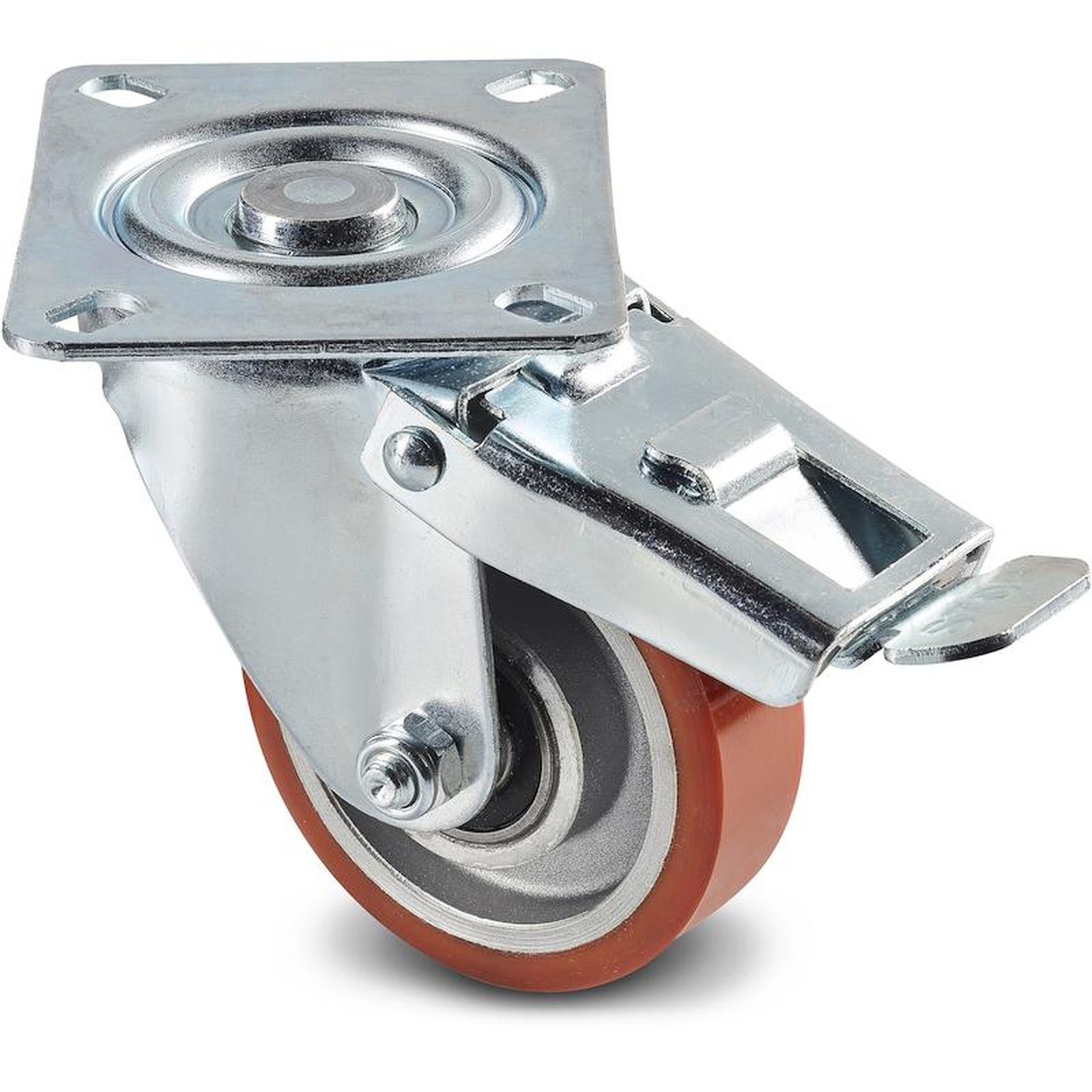 ALUMINIUM / POLYURETHANE WHEEL WITH RECTANGULAR SWIVEL STEEL PLATE - WITH BRAKE AND BEARINGS