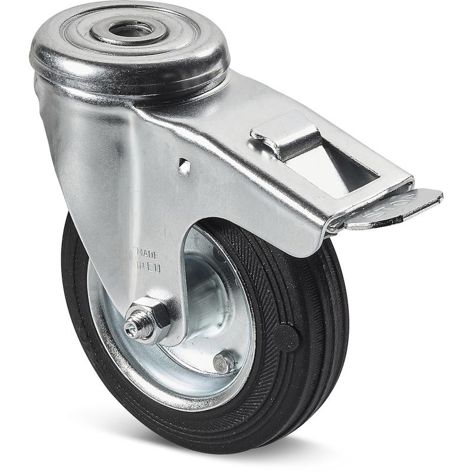 SHEET METAL RIM / RUBBER WHEEL WITH ROUND STEEL SWIVEL SUPPORT AND SMOOTH THROUGH HOLE WITH BRAKE