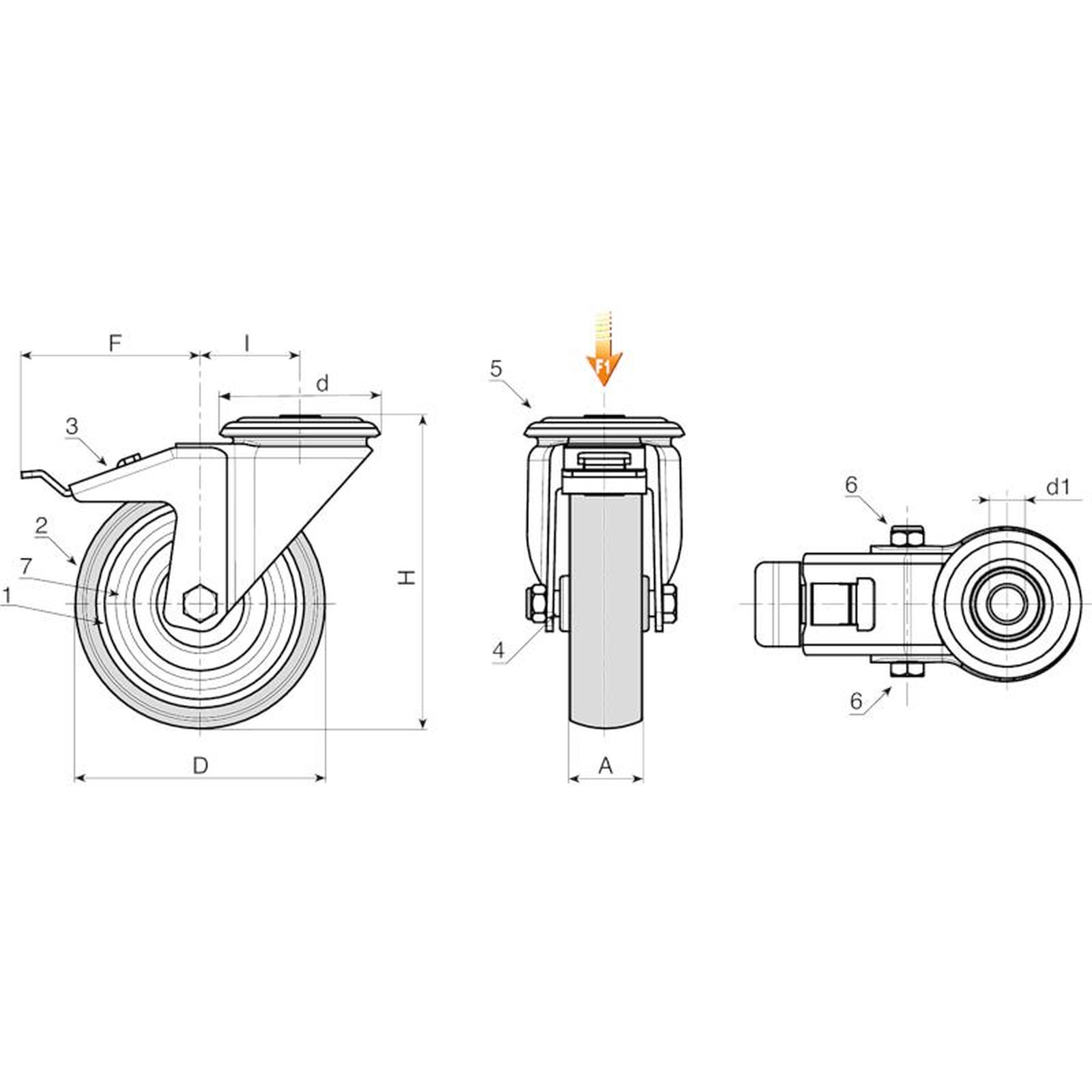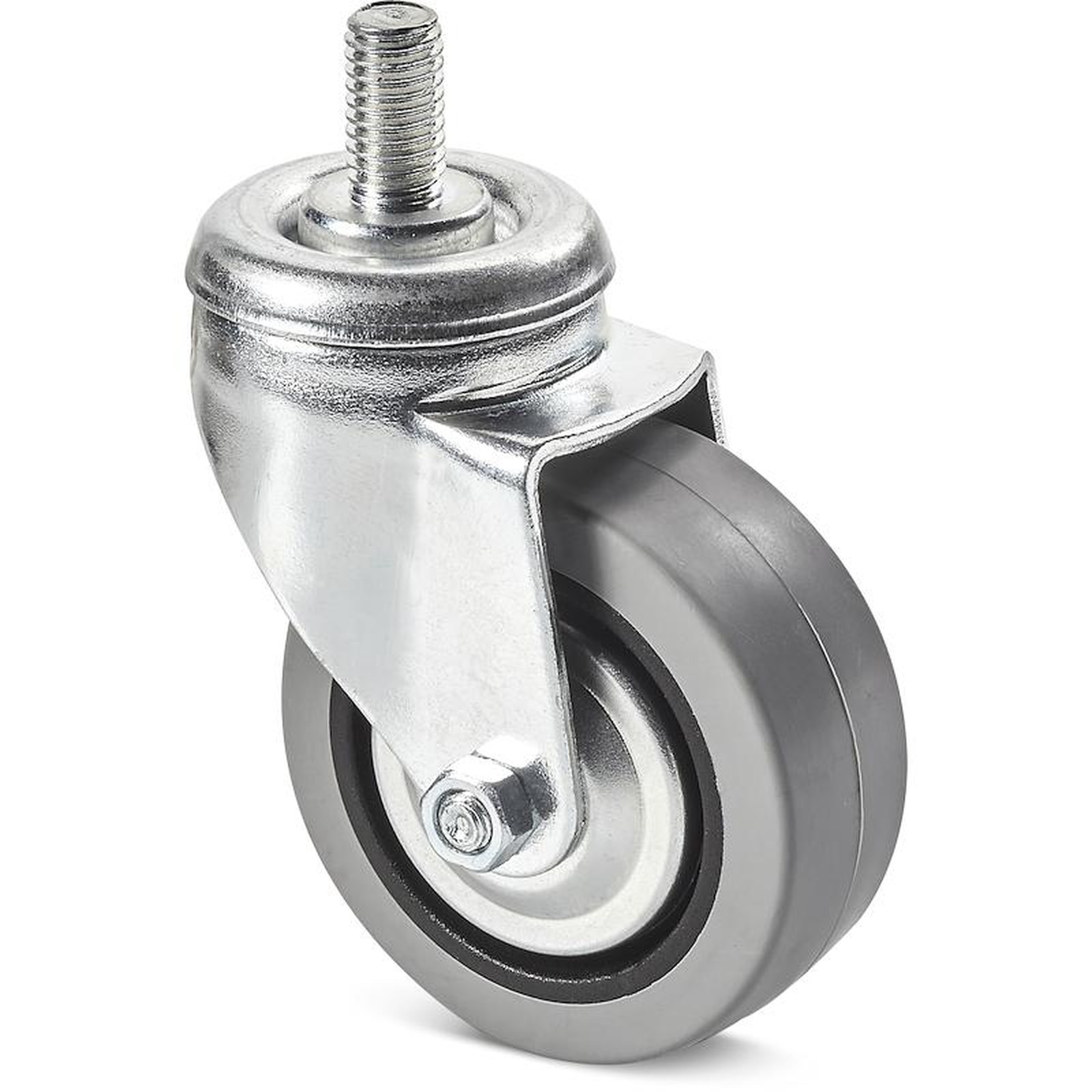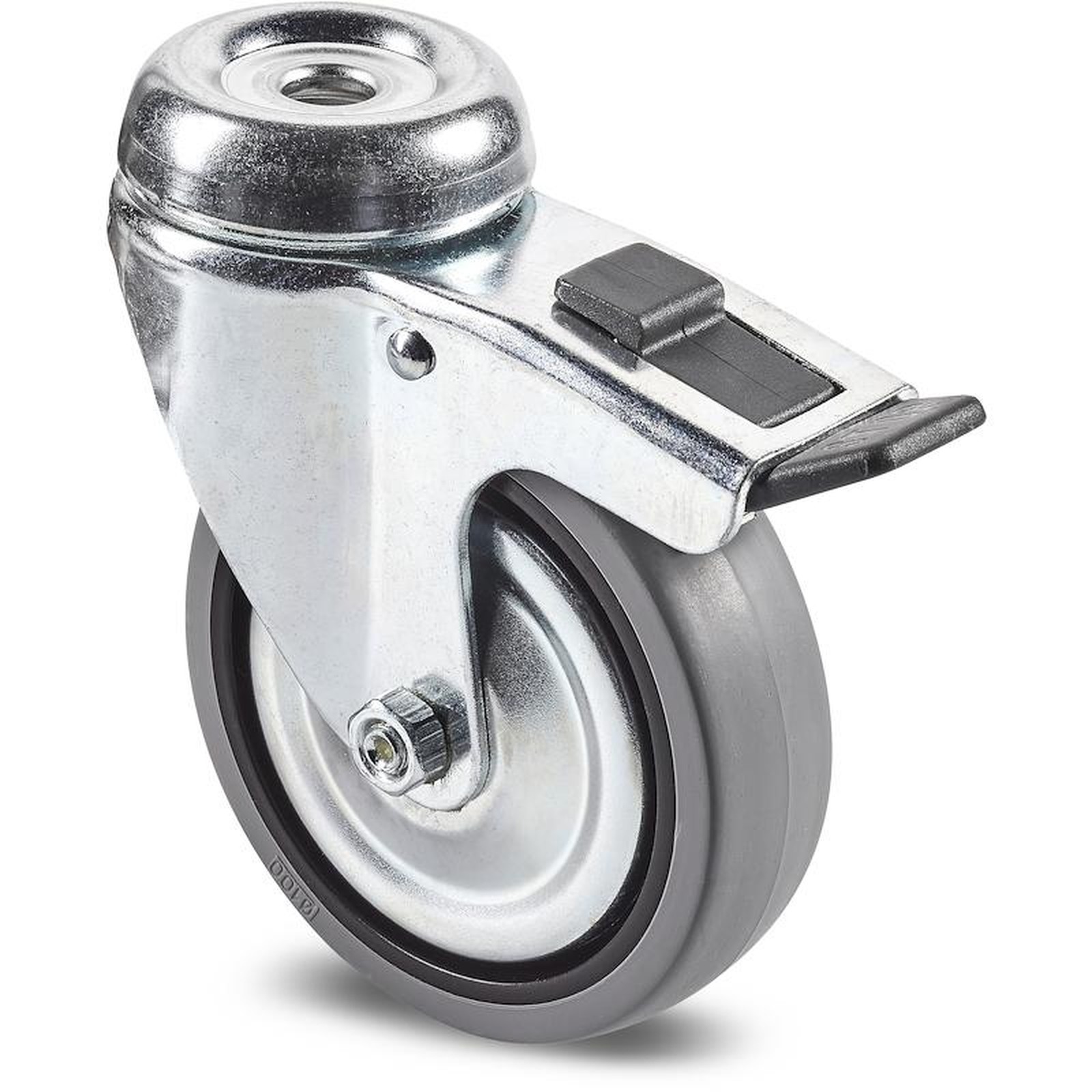 POLYPROPYLENE / RUBBER WHEEL WITH ROUND STEEL SWIVEL SUPPORT AND SMOOTH THROUGH HOLE WITH BRAKE