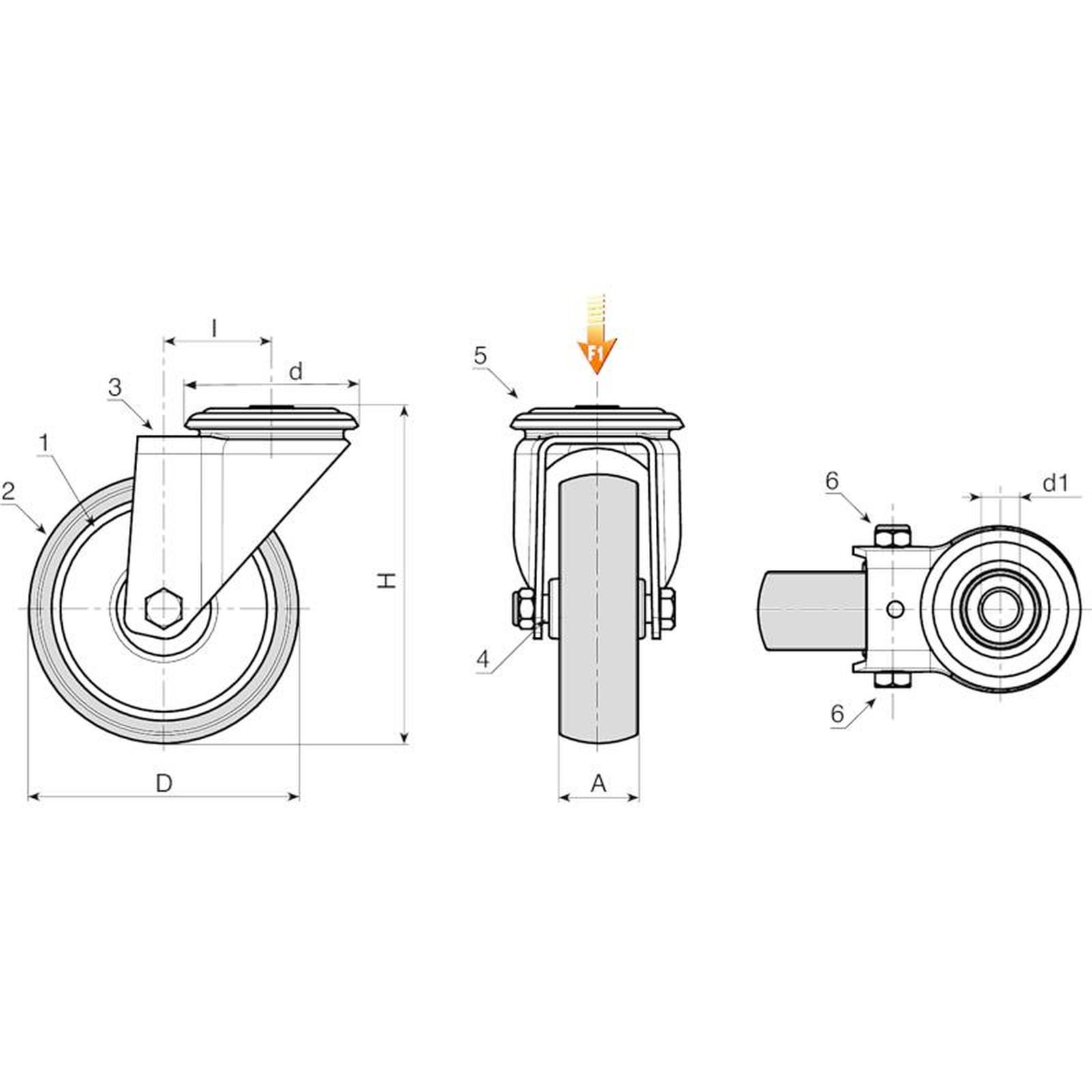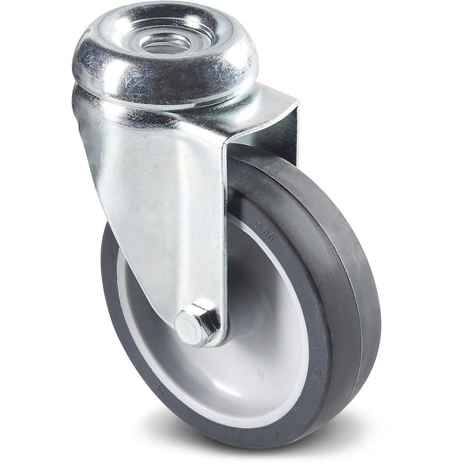 POLYPROPYLENE / RUBBER WHEEL WITH ROUND STEEL SWIVEL SUPPORT AND SMOOTH THROUGH HOLE