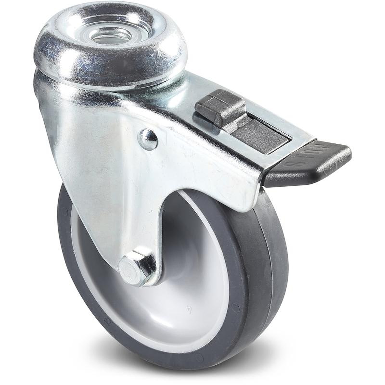 POLYPROPYLENE / RUBBER WHEEL WITH ROUND STEEL SWIVEL SUPPORT AND SMOOTH THROUGH HOLE WITH BRAKE