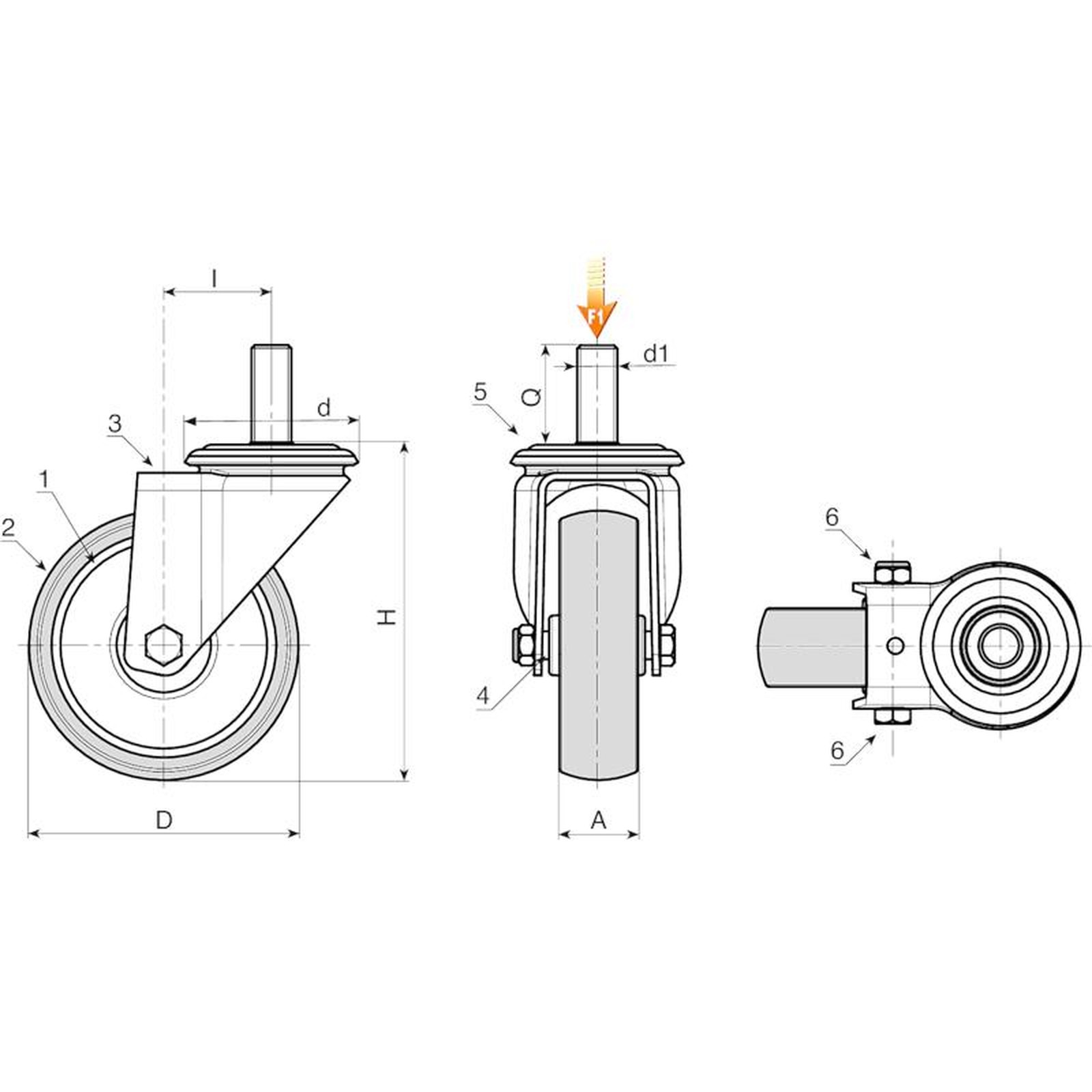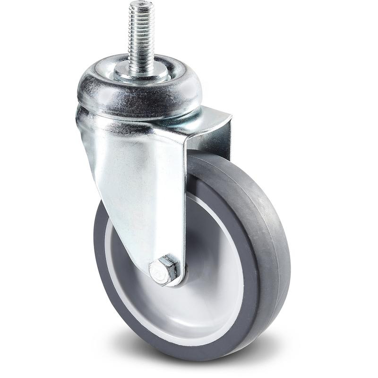 POLYPROPYLENE / RUBBER WHEEL WITH ROUND STEEL SWIVEL SUPPORT AND THREADED STUD