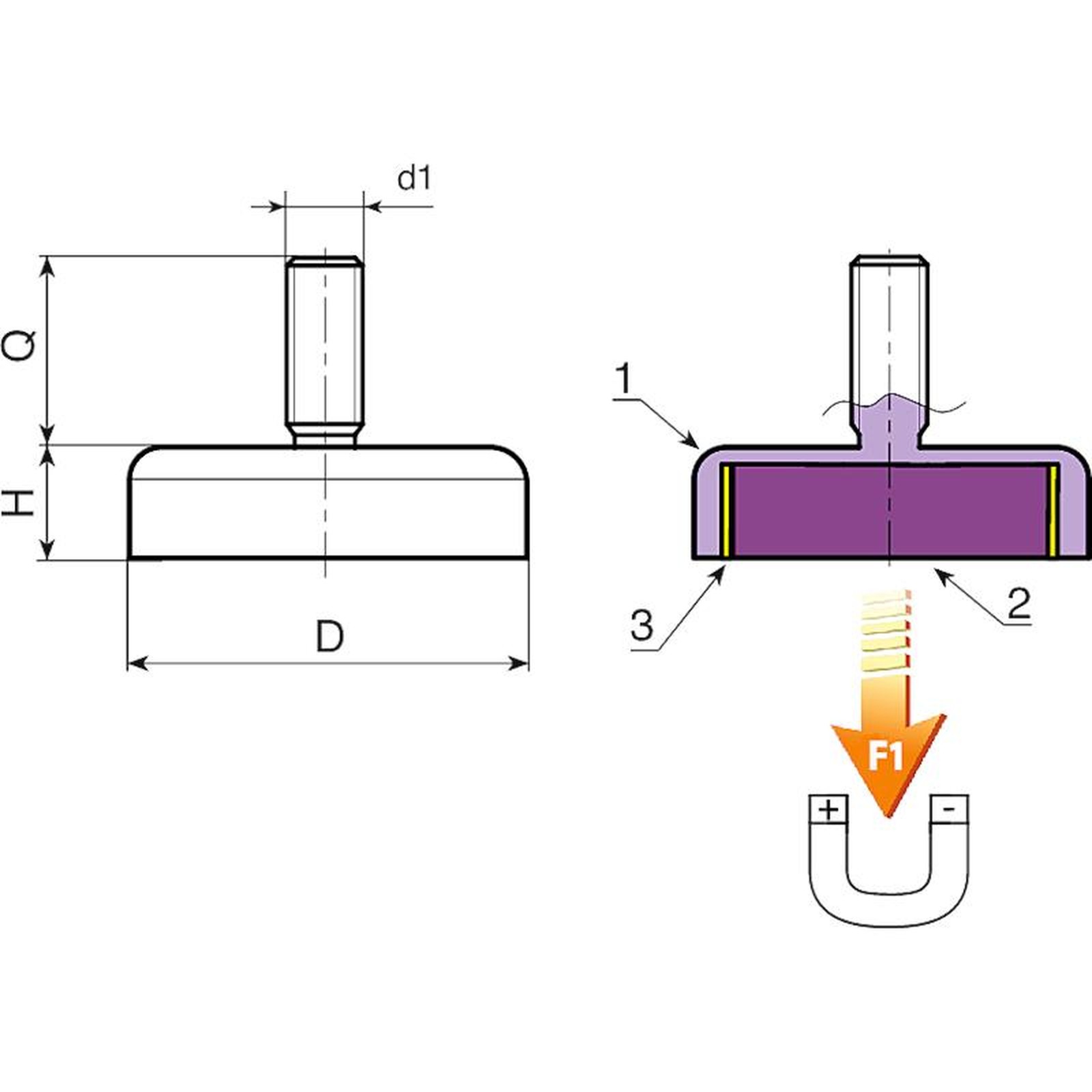 | Code | art. | D ±0,1 | H ±0,2 | d1 6g | Q ±0,5 | Weight (g) | F1 (N) |