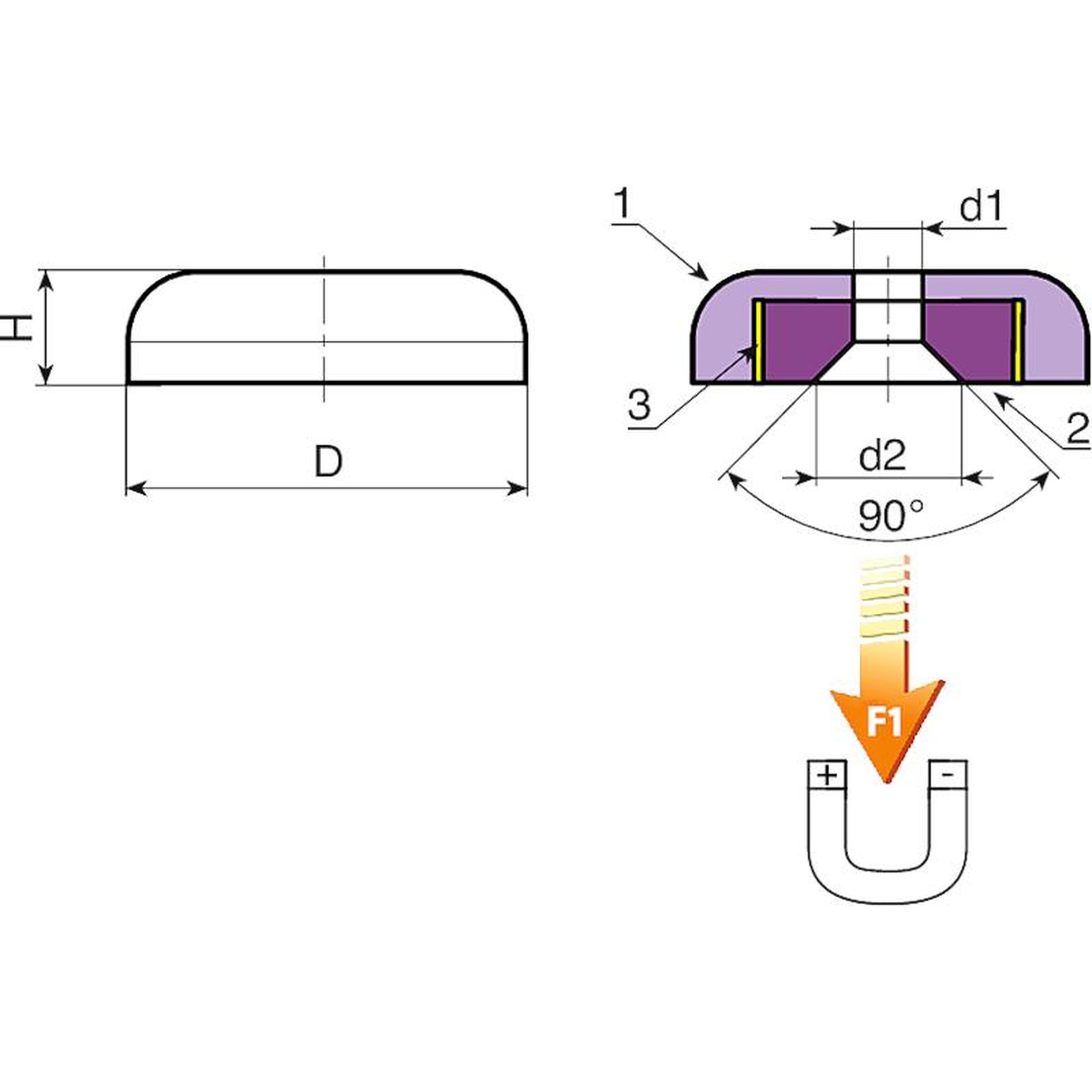 | Code | art. | D ±1 | H ±0,5 | d2 | d1 | Weight (g) | F1 (N) |