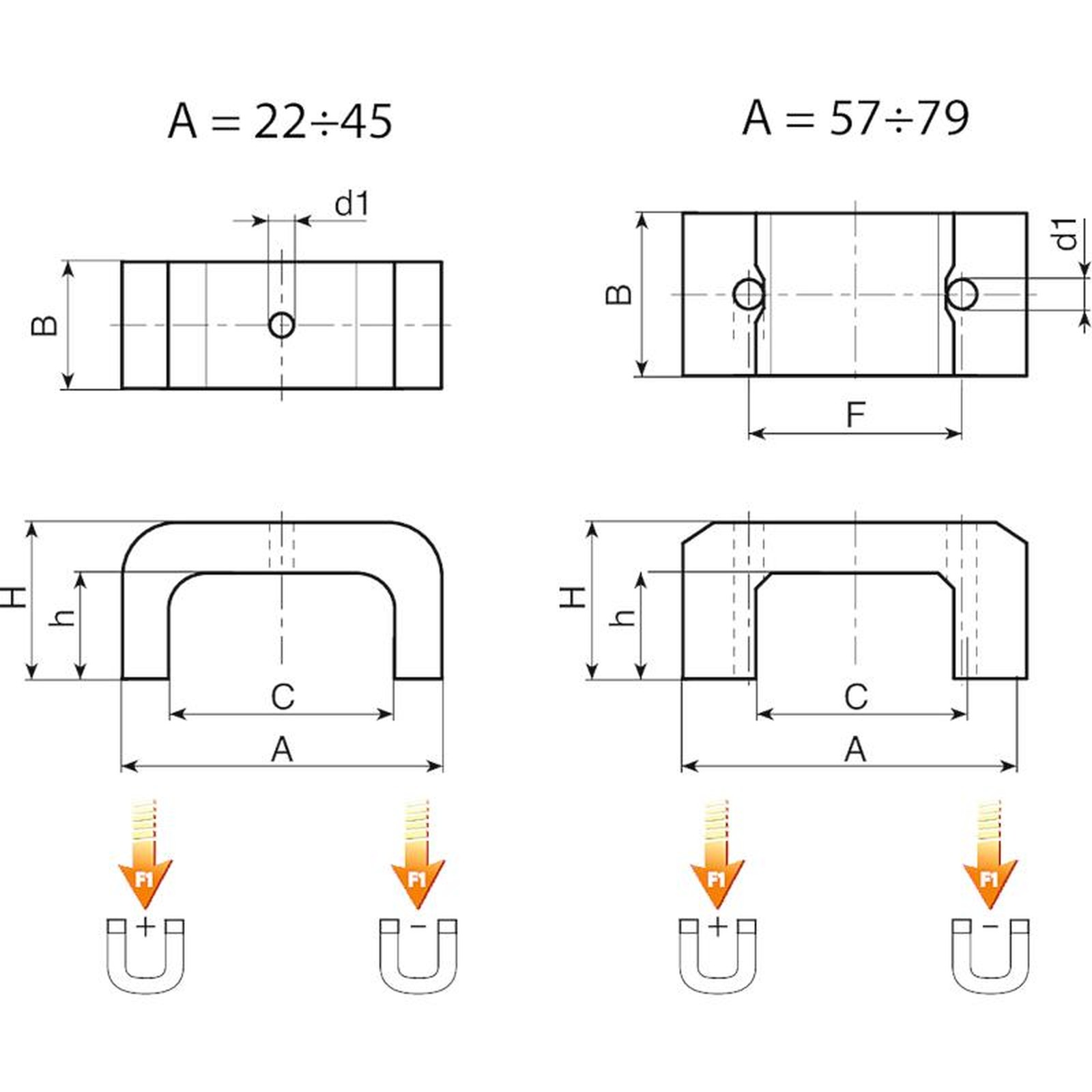| Code | art. | A | B | H | C | F | h | d1 | Weight (g) | F1 (N) |