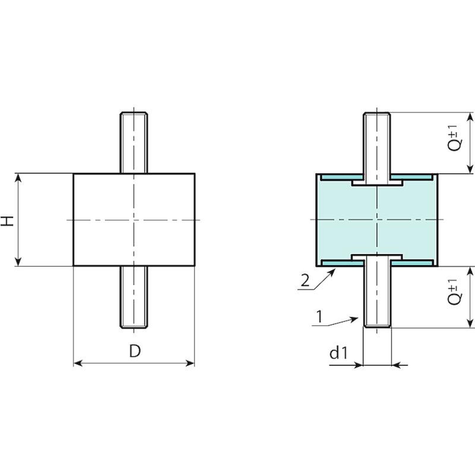 | Code | Art. | D | H | d1 6g | Q | Weight (g) | Compression stiffness (N/mm) |