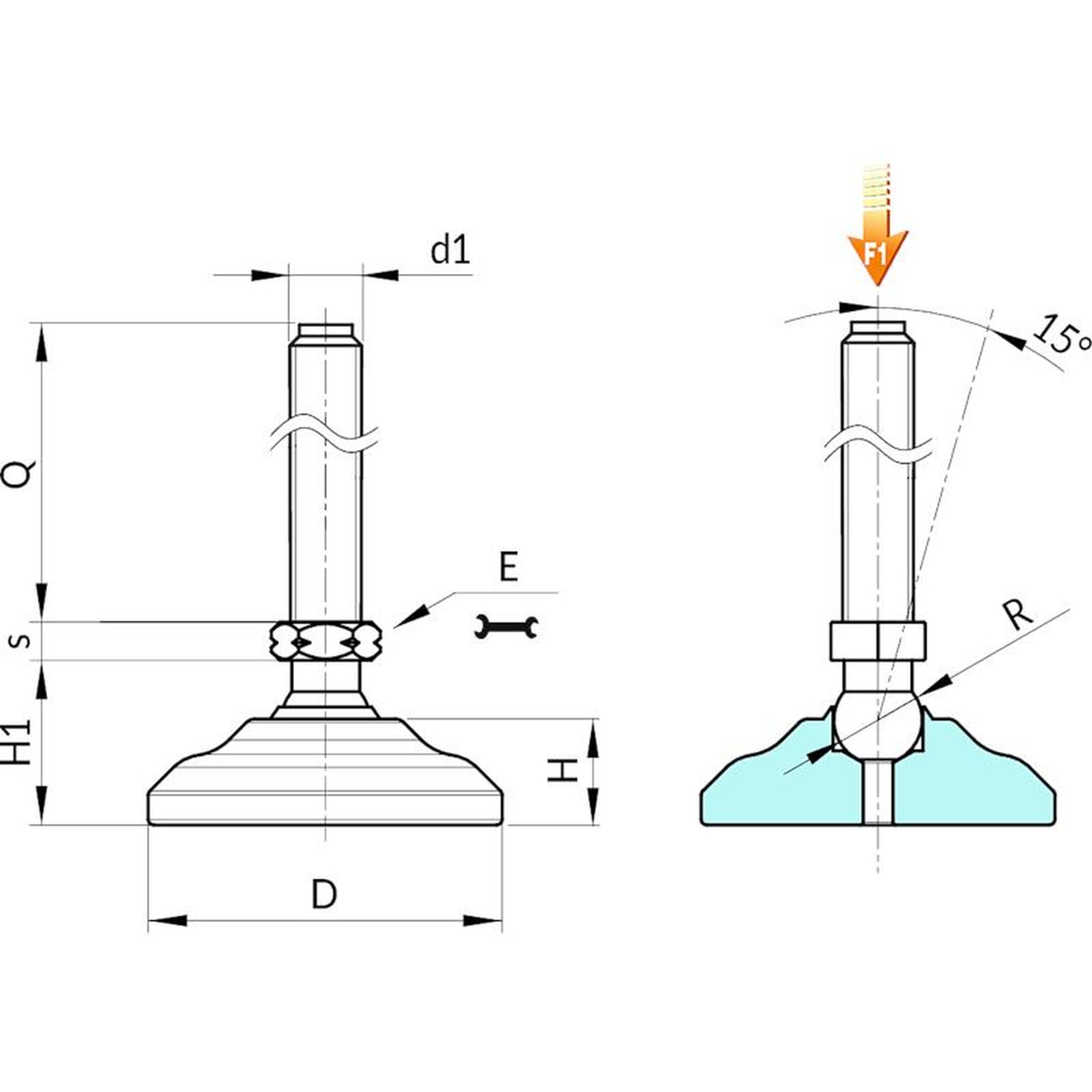 | Code | Art. | D | H | H1 | E | s | R | d1 6g | Q | Weight (g) | F1 (kN) |