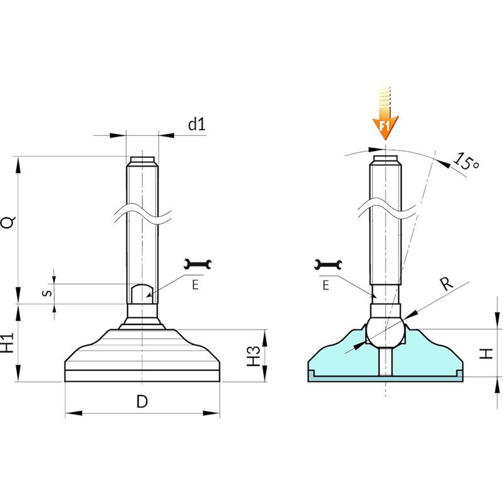 | Code | Art. | D | H | H1 | H3 | E | s | R | d1 6g | Q | Weight (g) | F1 (kN) |
