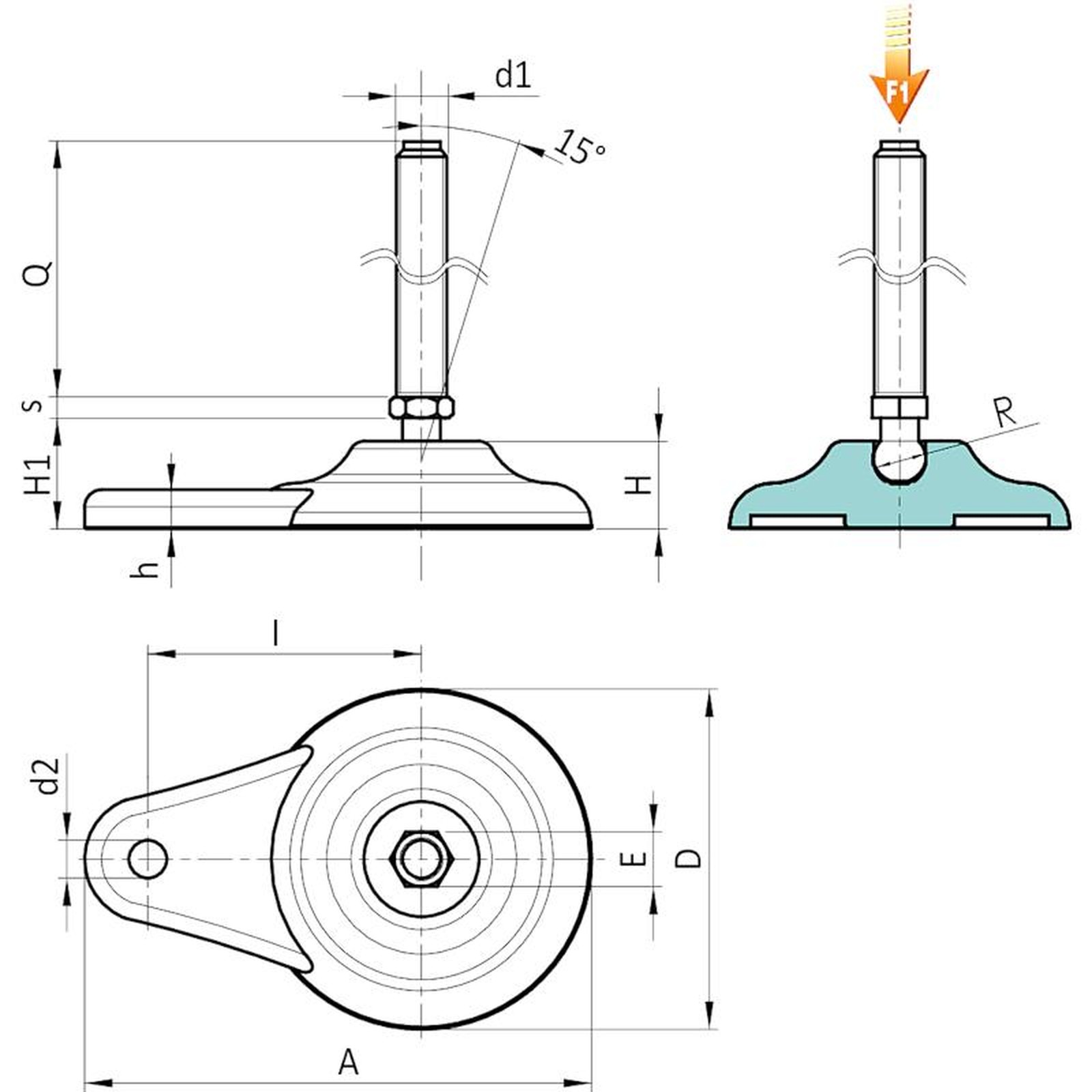 | Code | Art. | D | H | I | H1 | h | A | E | s | d2 | R | d1 | Q | Weight (g) | F1 (kN) |
