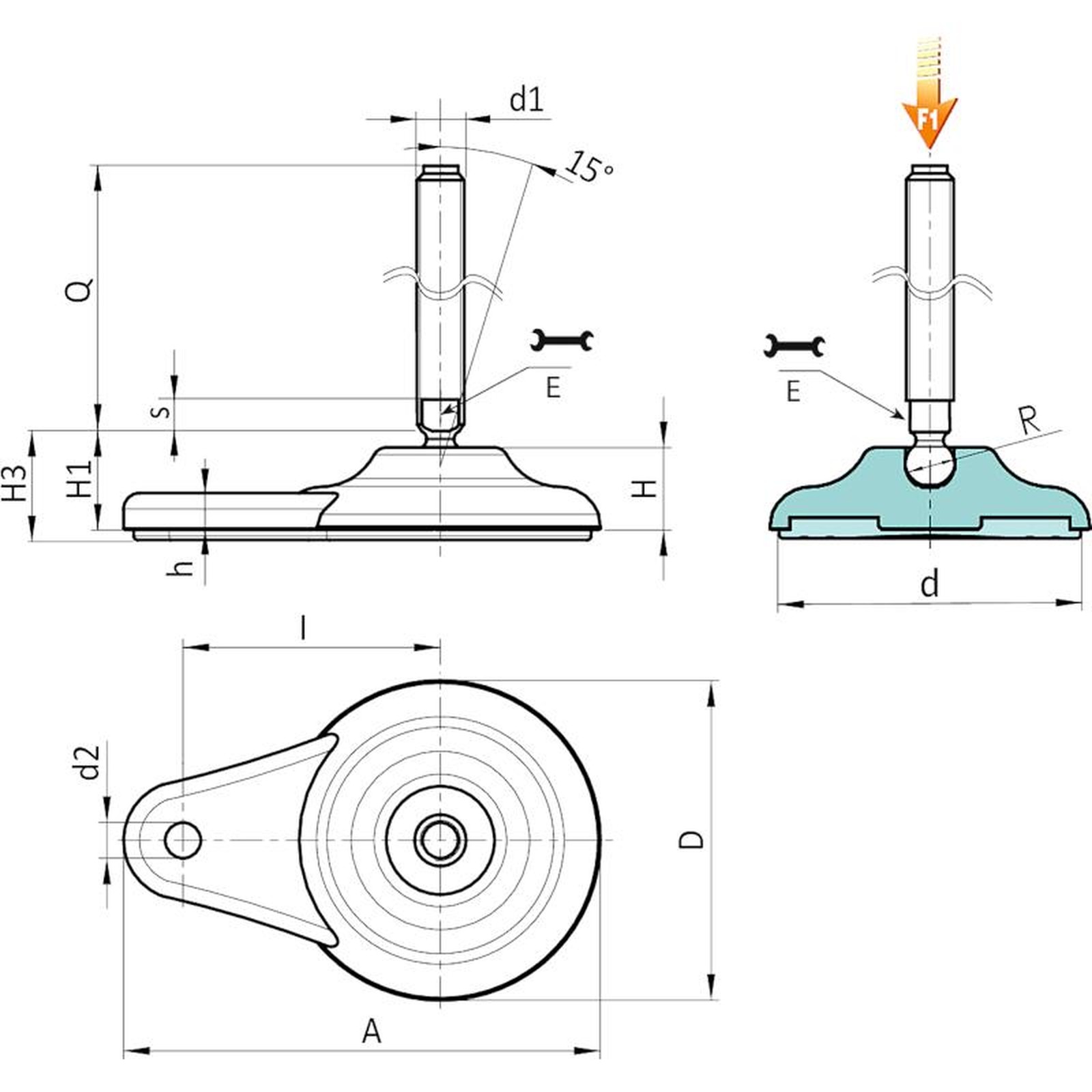 | Code | Art. | D | H | I | H1 | H3 | h | A | E | s | d2 | d | R | d1 6g | Q | Weight (g) | F1 (kN) |