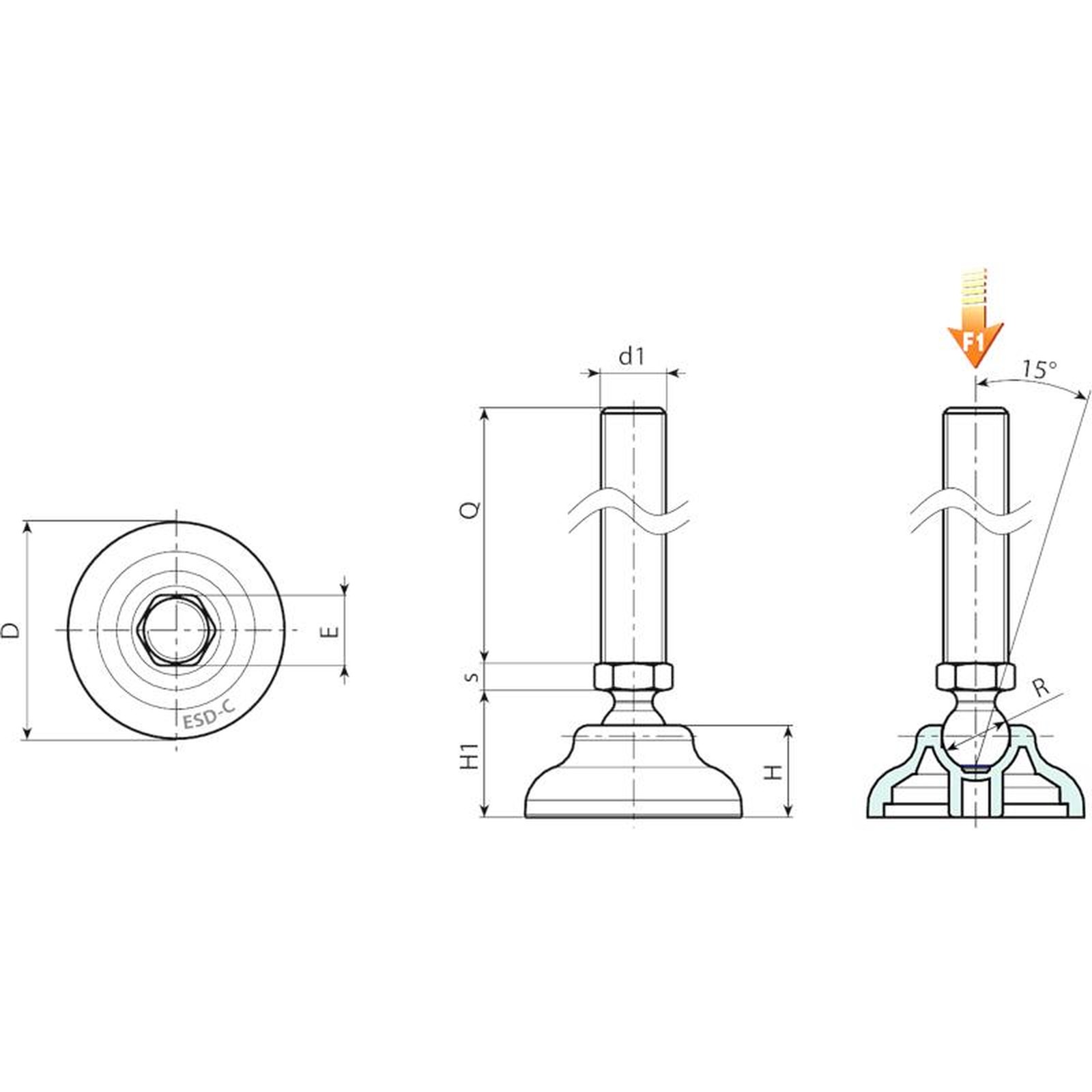 | Code | Art. | D | H | H1 | E | s | R | d1 6g | Q | Weight (g) | F1 (kN) |