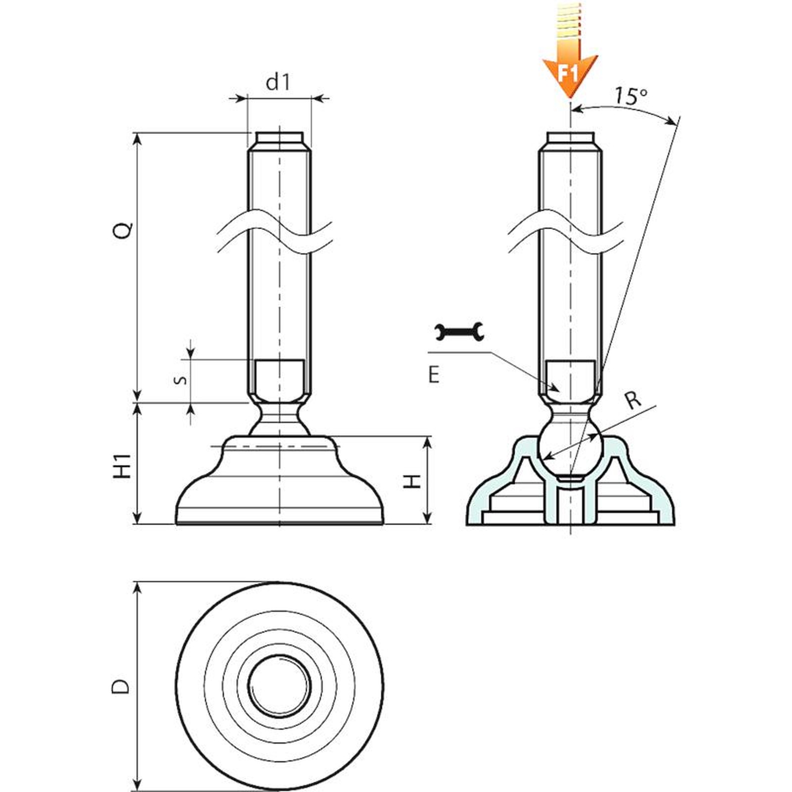 | Code | Art. | D | H | H1 | E | s | R | d1 6g | Q | Weight (g) | F1 (kN) |