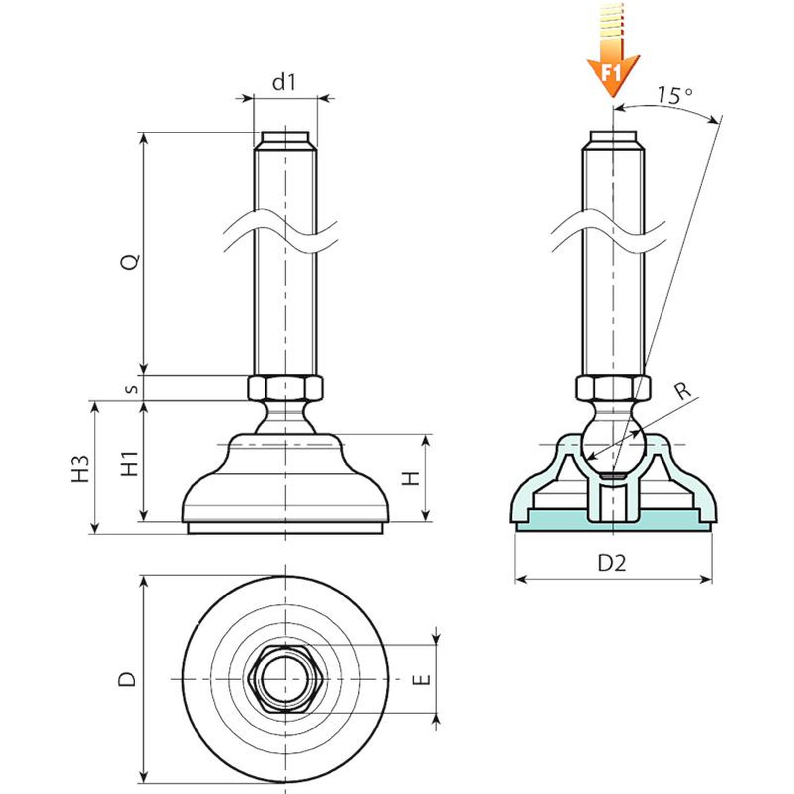 Version P908: Mounting foot with stem type A (with hexagonal base) and ball 15 - with SBS non-slip base