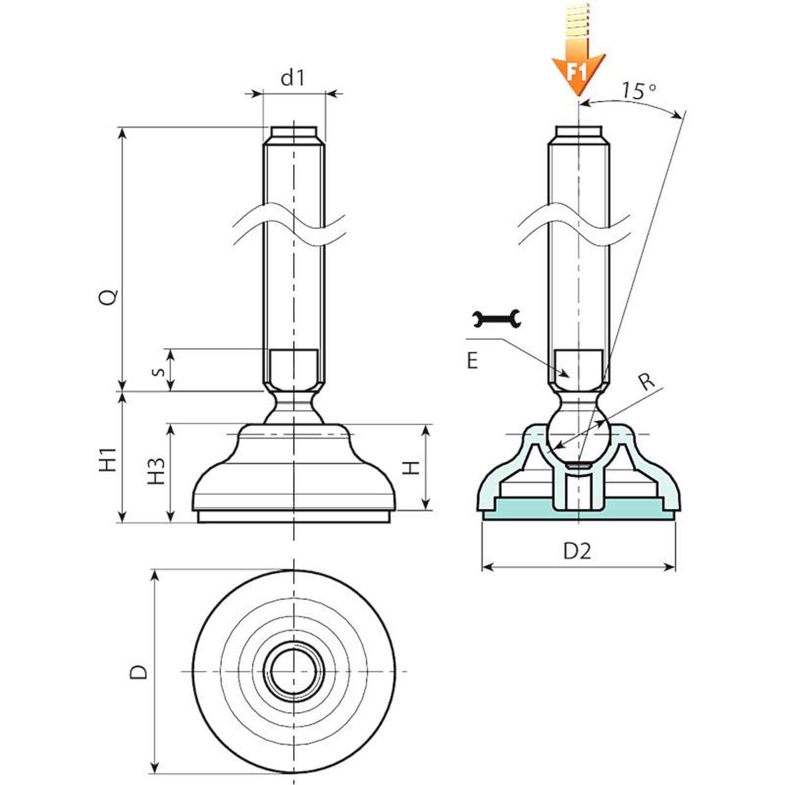 | Code | Art. | D | D2 | H | H1 | H3 | E | s | R | d1 6g | Q | Weight (g) | F1 (kN) |