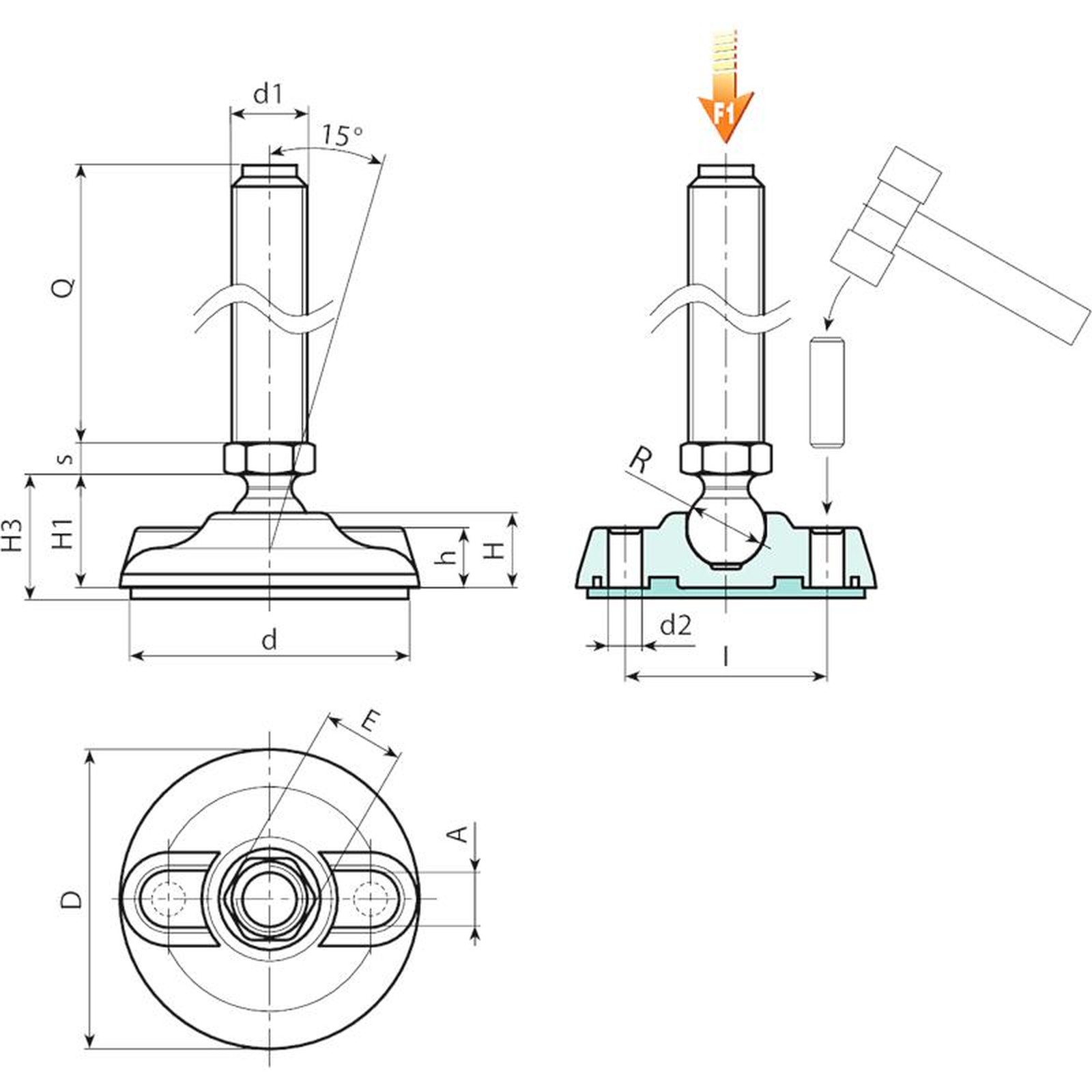 Version P915: Mounting foot with stem type A (with hexagonal base) and ball 12.4 - with SBS non-slip base