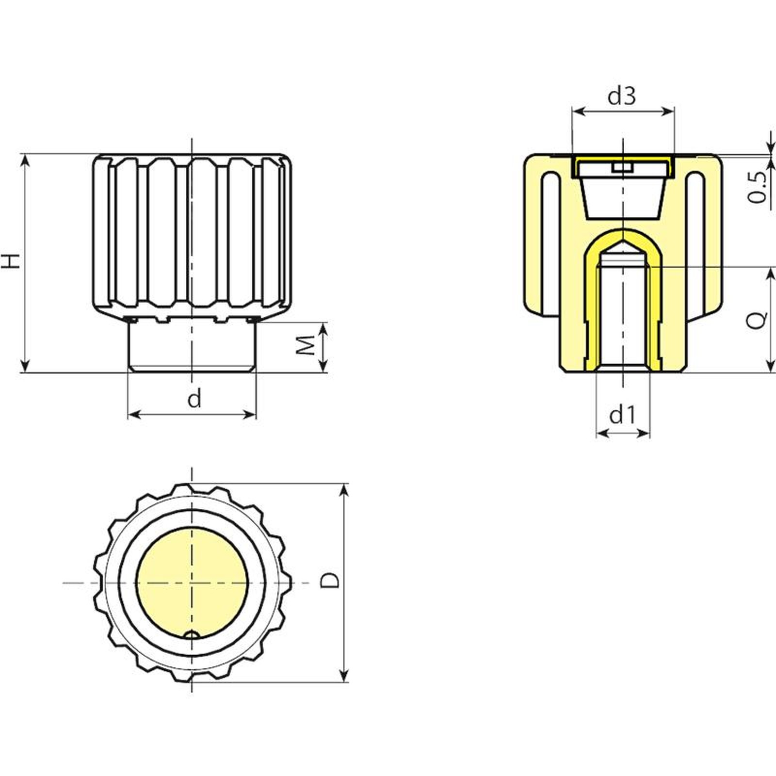 | Code | Art. | D | H | M | d | d3 | d1 6H | Q | Weight (g) |