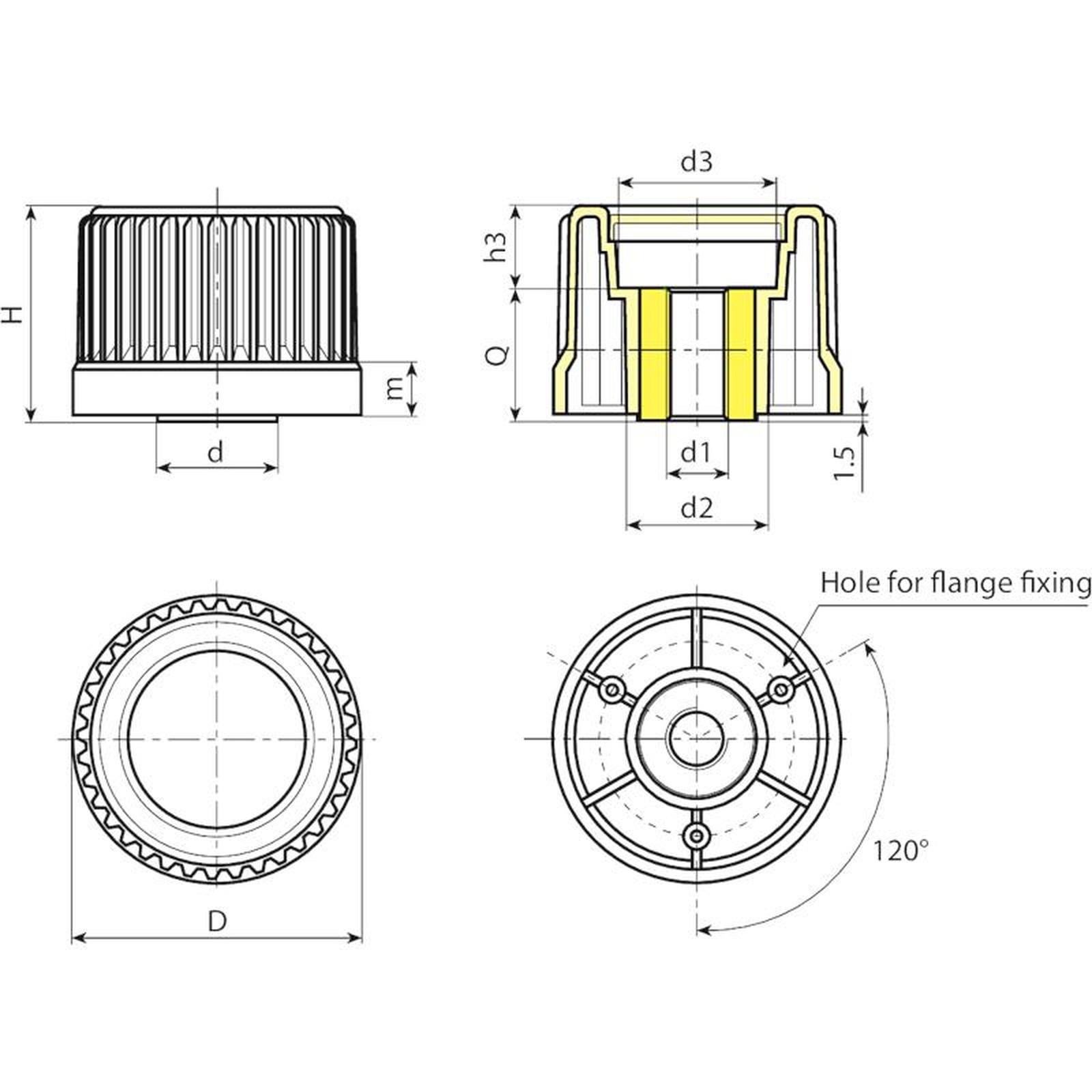 | Code | Art. | D | H | m | d | d2 | d3 | h3 | d1 6H | Q | Weight (g) |