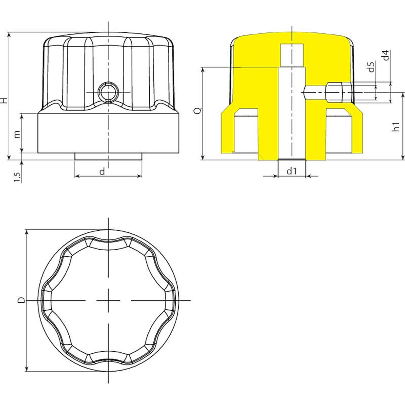 | Code | Art. | D | H | m | d | d4 | d5 | h1 | d1 | Q | Weight (g) |