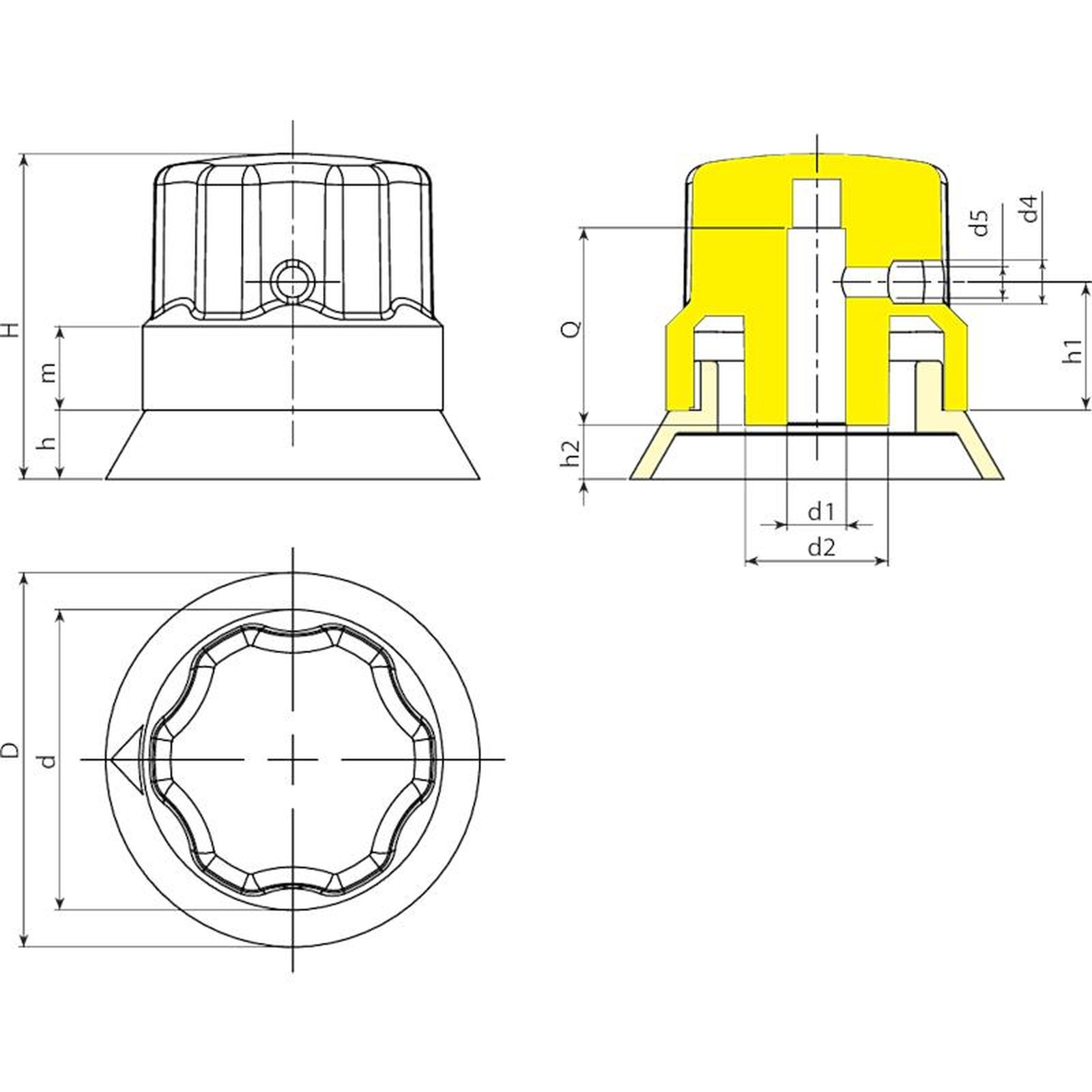 | Code | Art. | D | H | h | m | d | d2 | d4 | d5 | h1 | h2 | d1 | Q | Weight (g) |