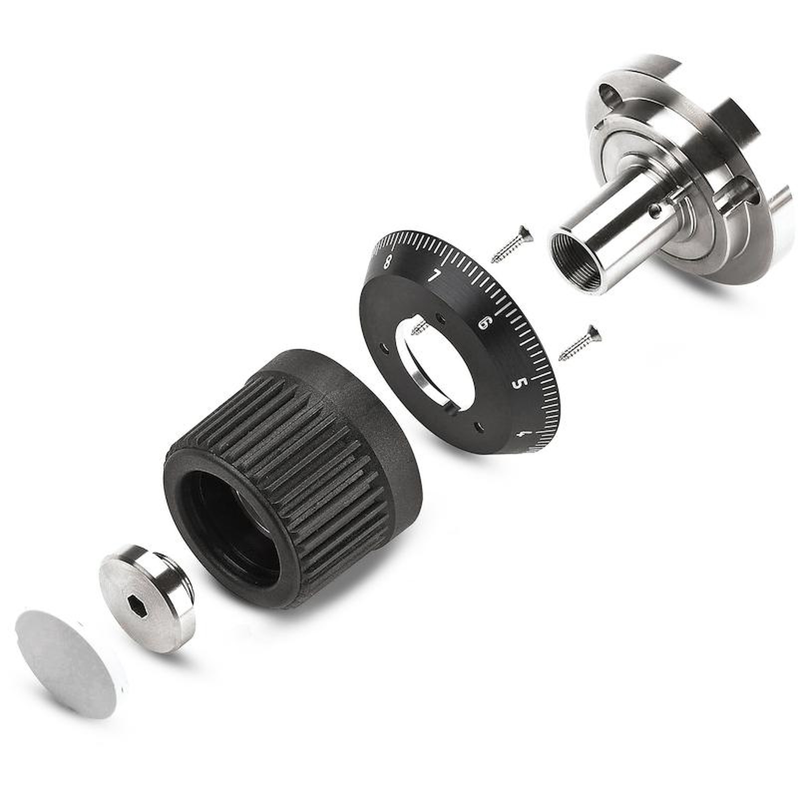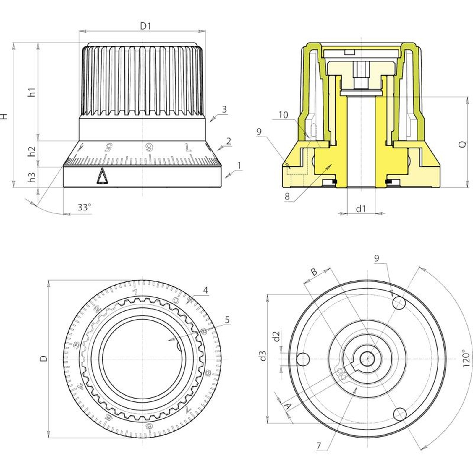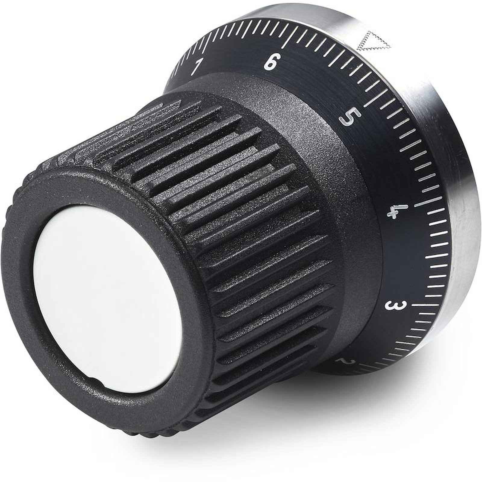 The standard numbering of the flange goes from 0 to 9 with 10 graduations for each unit. (100 graduations). Specific custom graduations are available for a minimum quantity of 30 pieces.