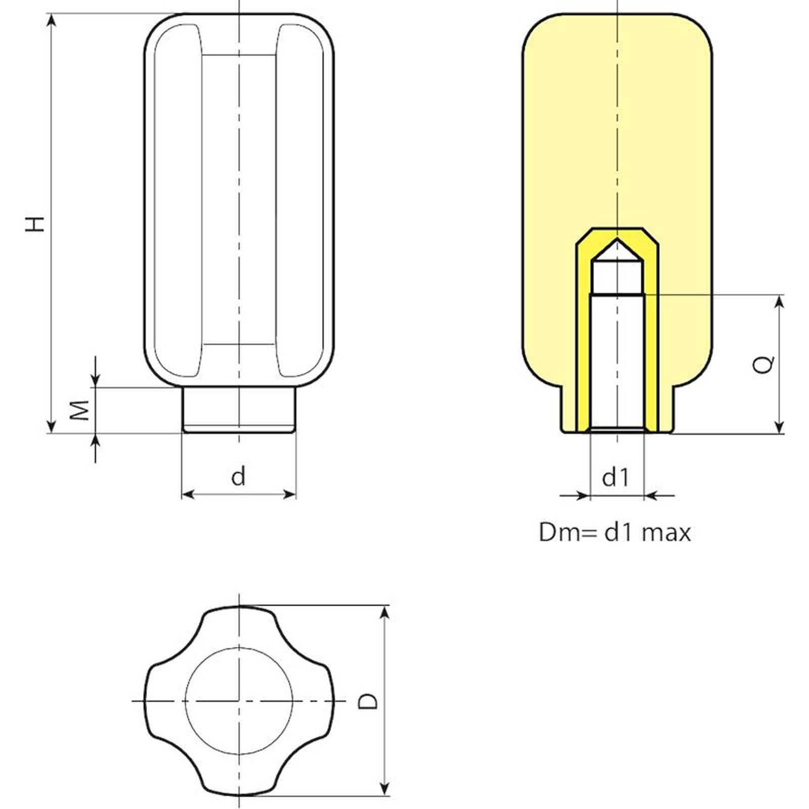 | Code | Art. | D | H | M | d | Dm | d1 H10 | Q | Weight (g) |