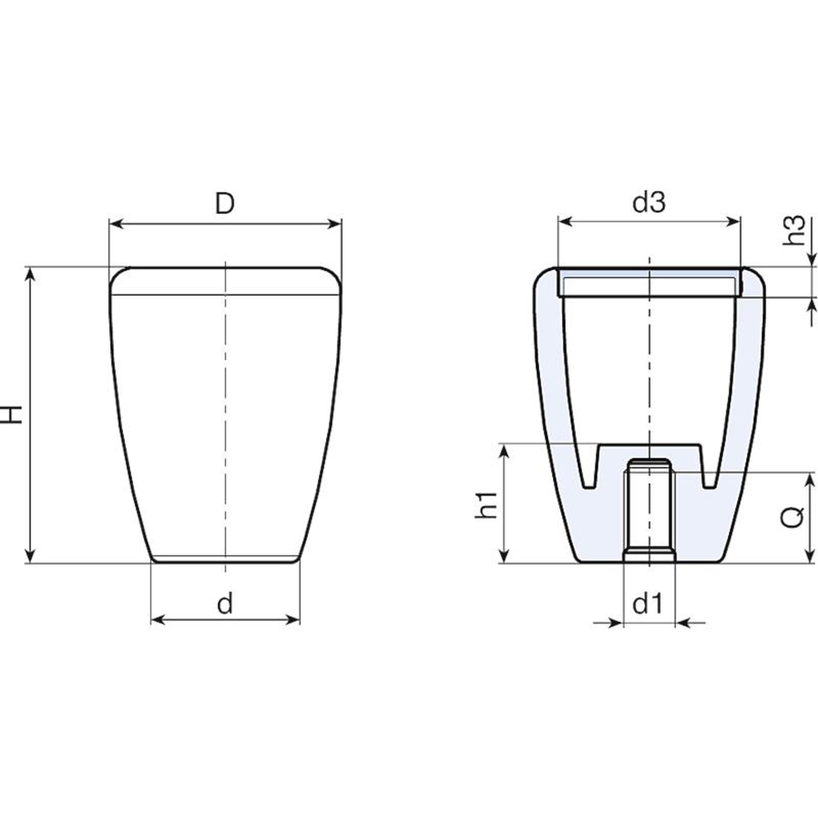 | Code | art. | D | H | d | h1 | d3 | h3 | d1 6H | Q | Weight (g) |