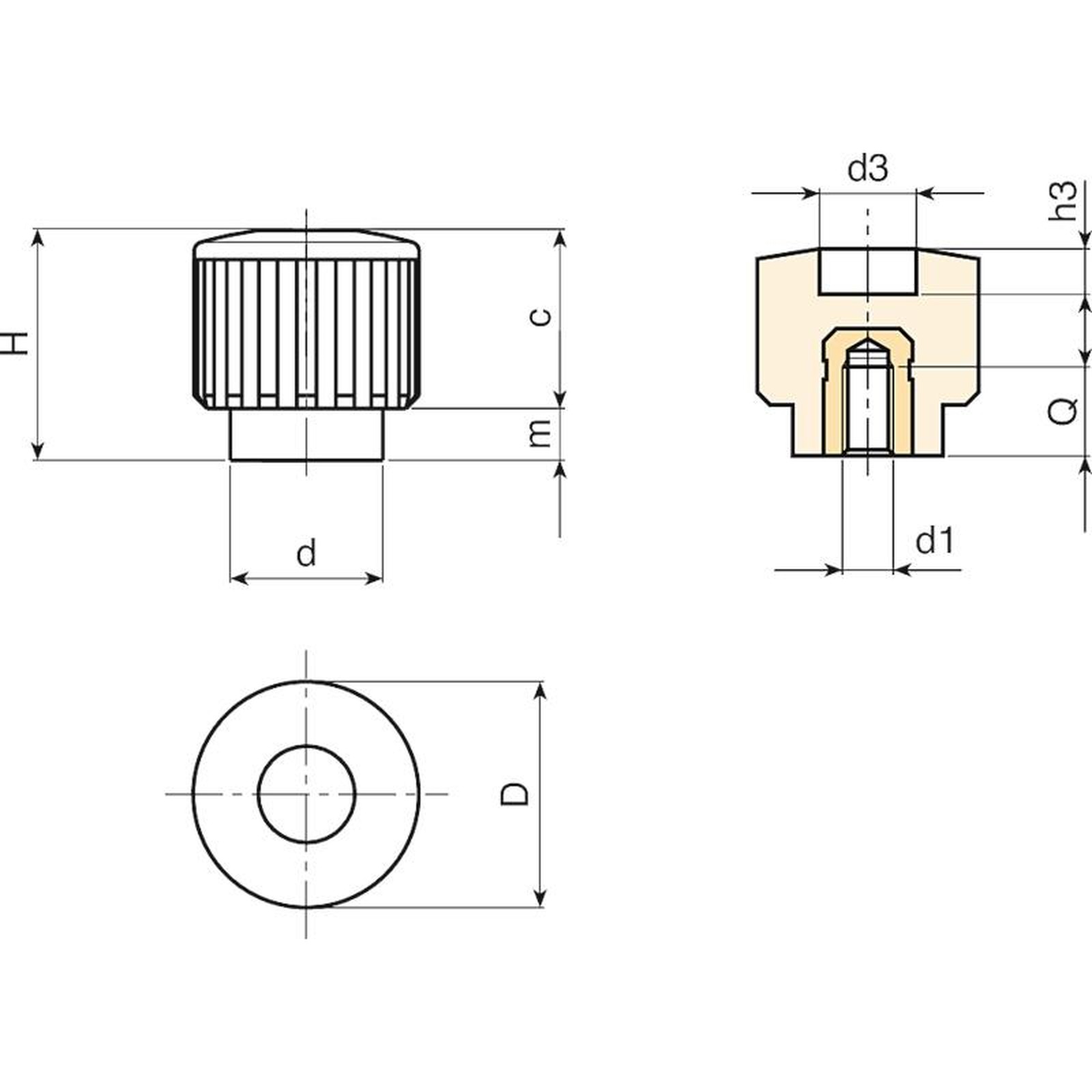 | Code | art. | D | H | d | m | c | d3 | h3 | d1 6H | Q | Weight (g) |