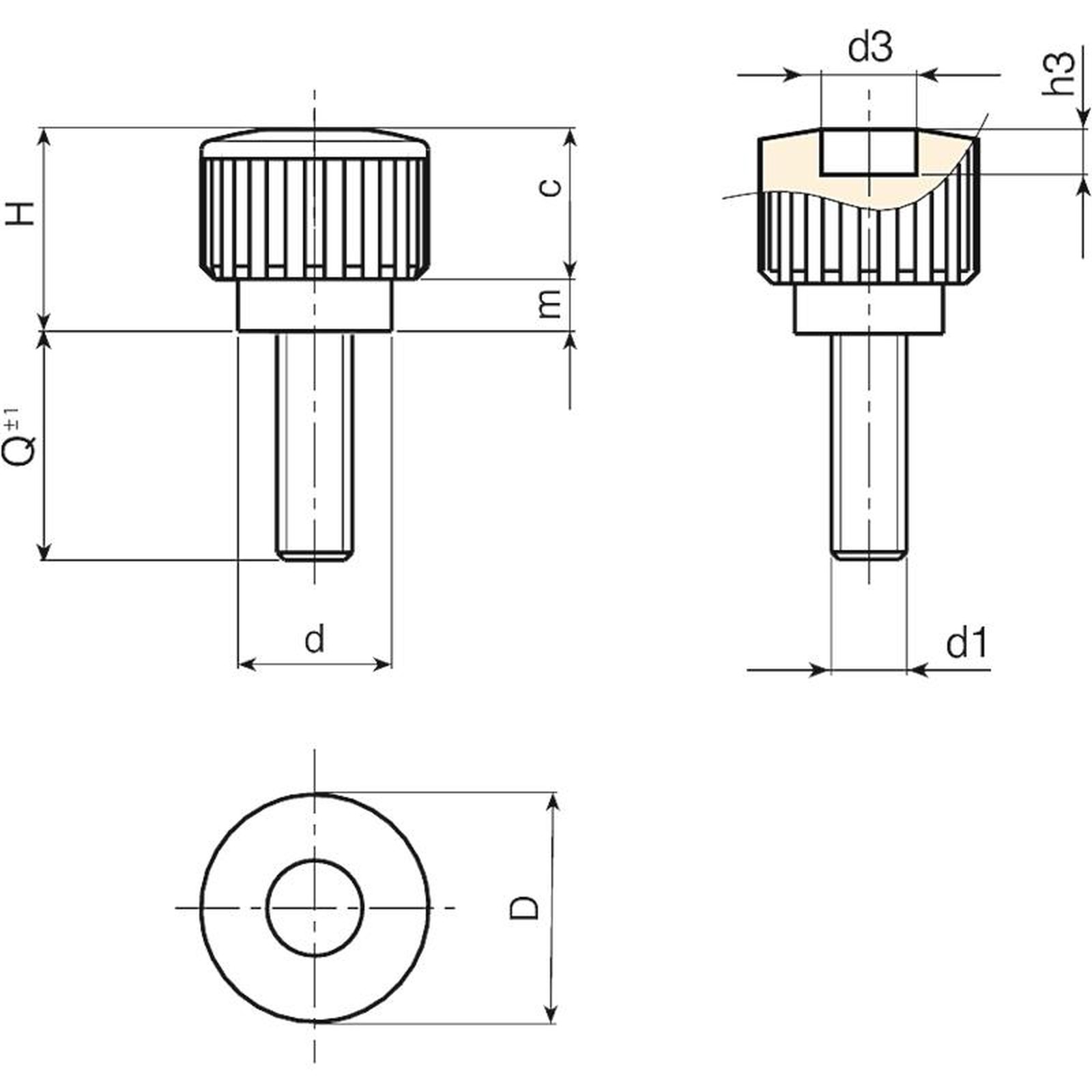 | Code | art. | D | H | d | m | c | d3 | h3 | LM | d1 6g | Q | Weight (g) |