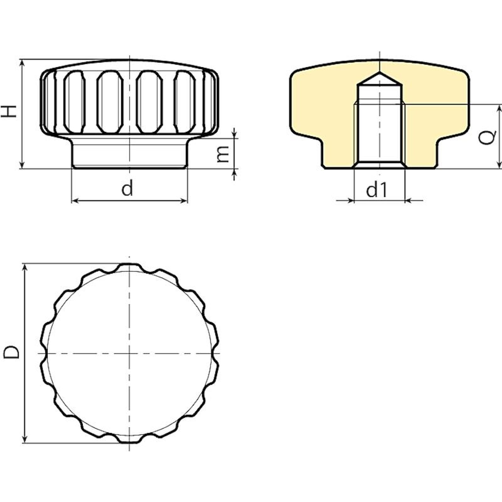 | Code | Art. | D | H | d | m | d1 6H | Q | Weight (g) |