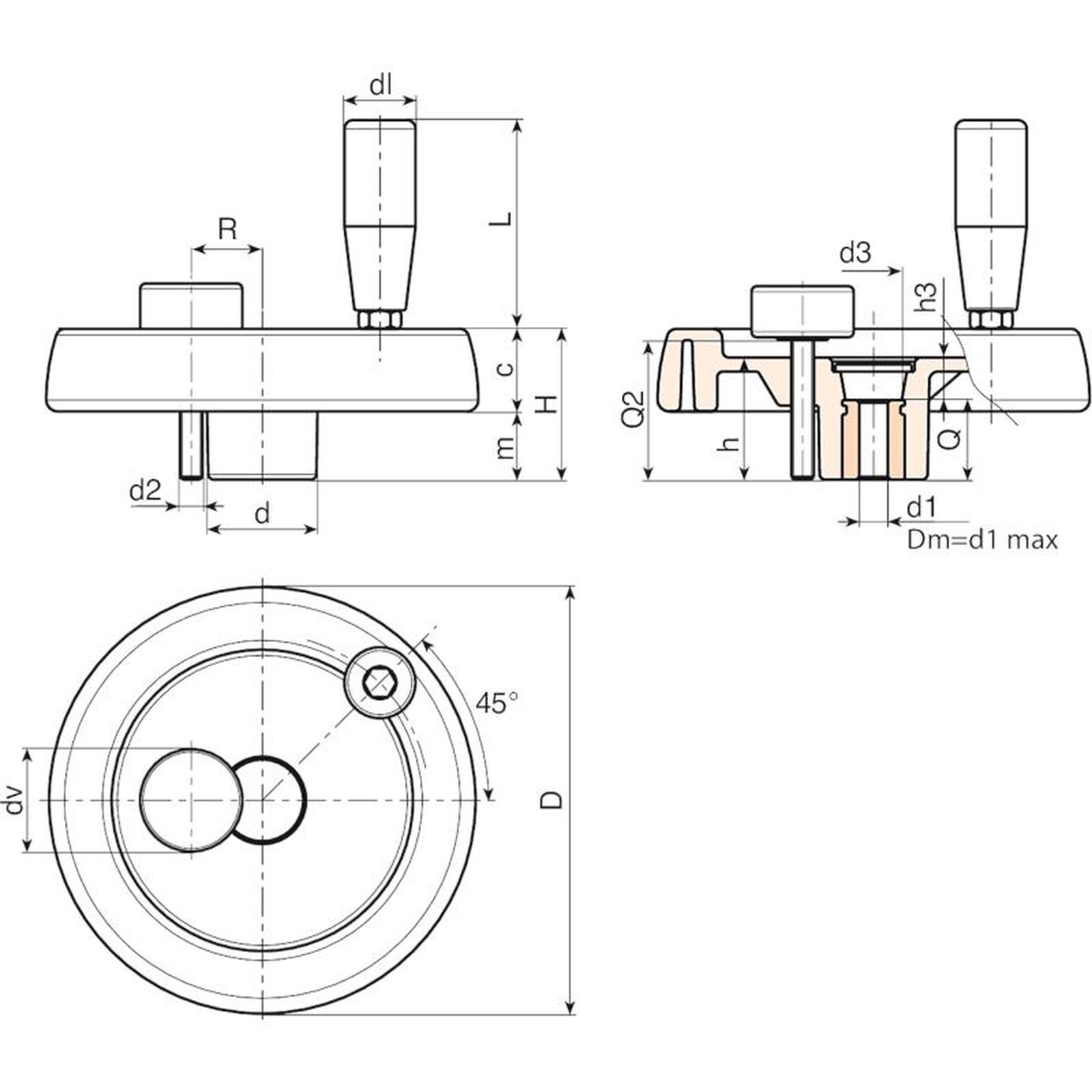| Code | Art. | D | H | h | d | m | c | d3 | h3 | R | d2 | Q2 | dl | L | Dm | d1 H10 | Q | Weight (g) |