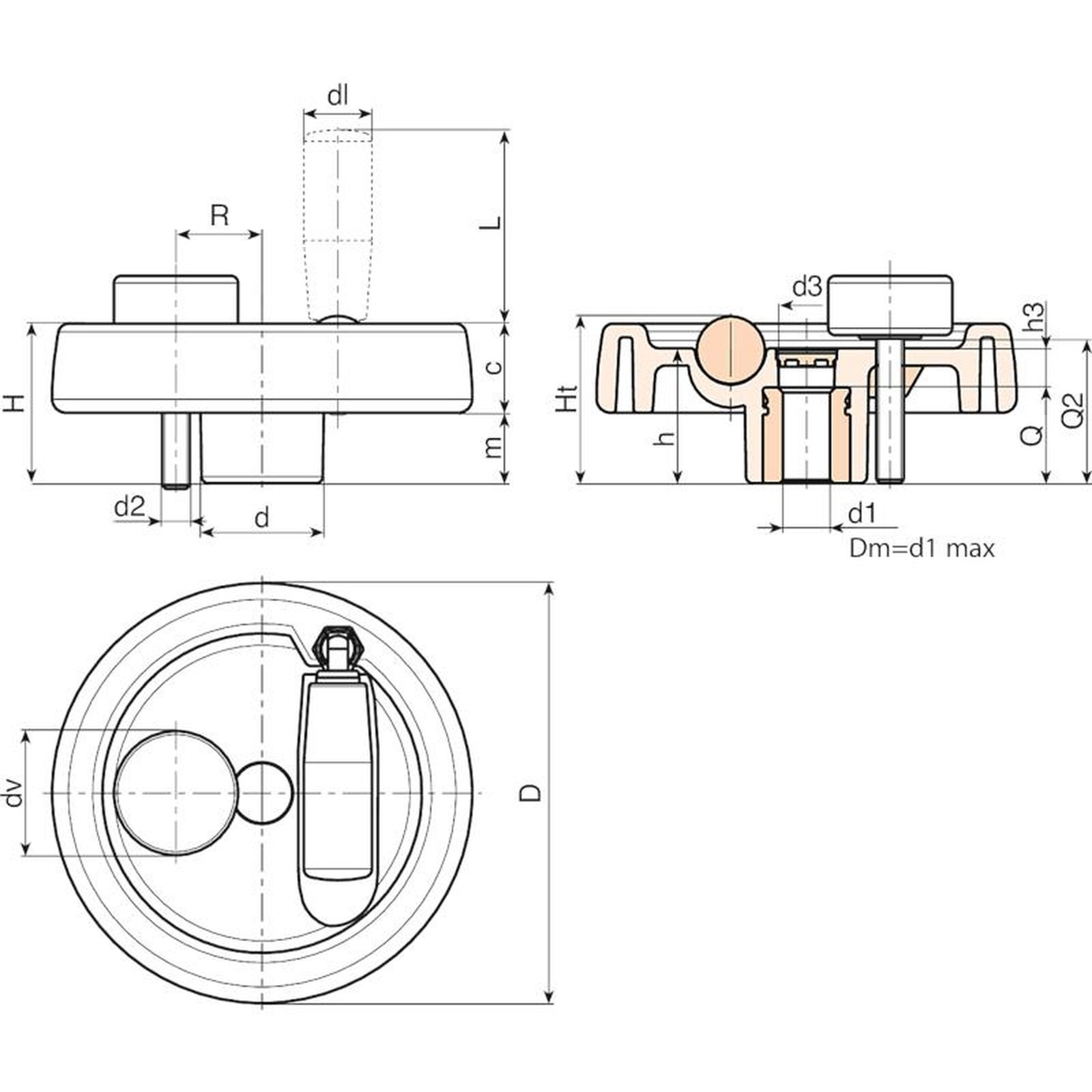 | Code | Art. | D | H | Ht | h | d | m | c | d3 | h3 | R | d2 | Q2 | dl | L | Dm | d1 H10 | Q | Weight (g) |