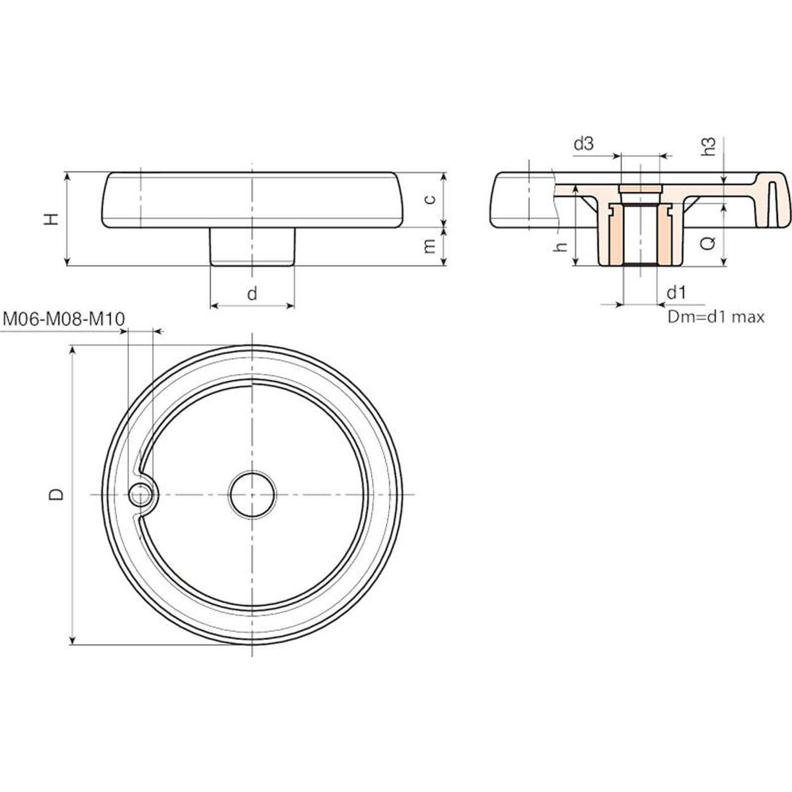| Code | Art. | D | H | h | d | m | c | d3 | h3 | Dm | d1 H10 | Weight (g) | Hole |