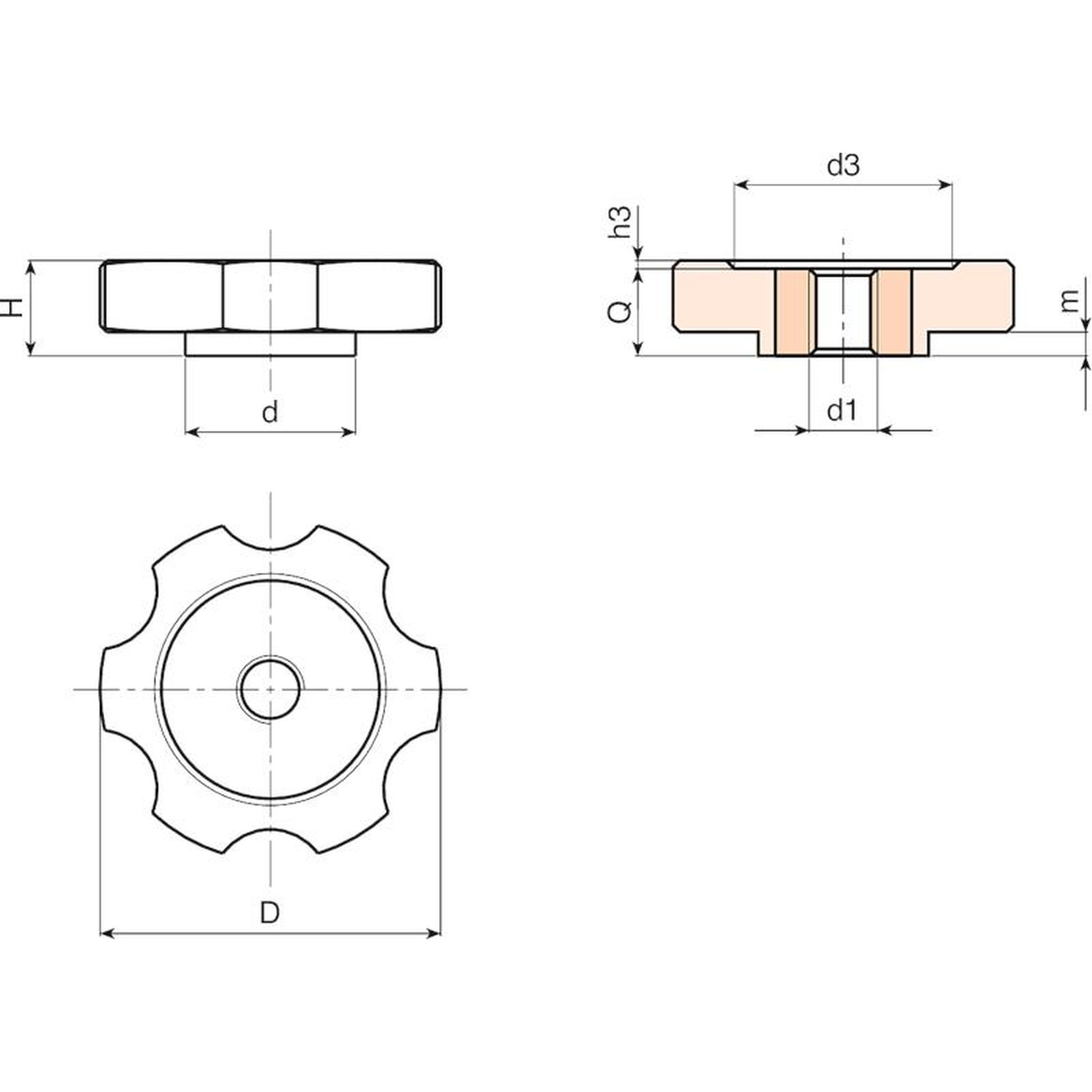 | Code | art. | D | H | d | m | h3 | d3 | d1 6H | Q | Weight (g) |