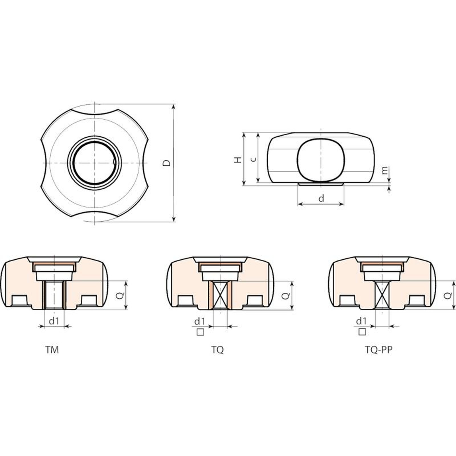 | Code | art. | D | H | d | d2 | d3 | c | m | d1 6H | Q | Weight (g) |