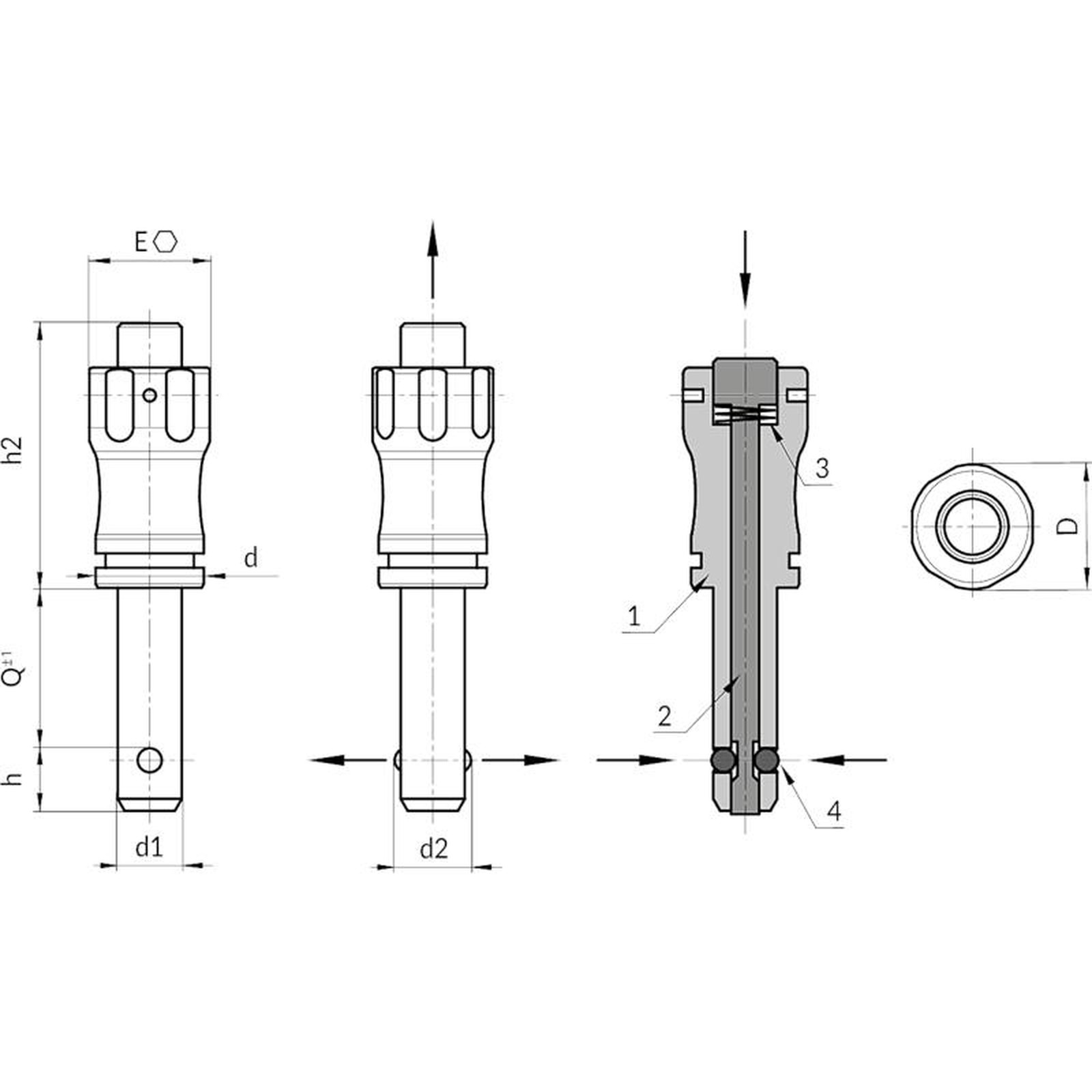 | Code | Art. | D | d | d2 | E | h | h2 | d1 H9 | Q (+0.6) | Weight (g) | Shear strength to double shear strength max. kN |