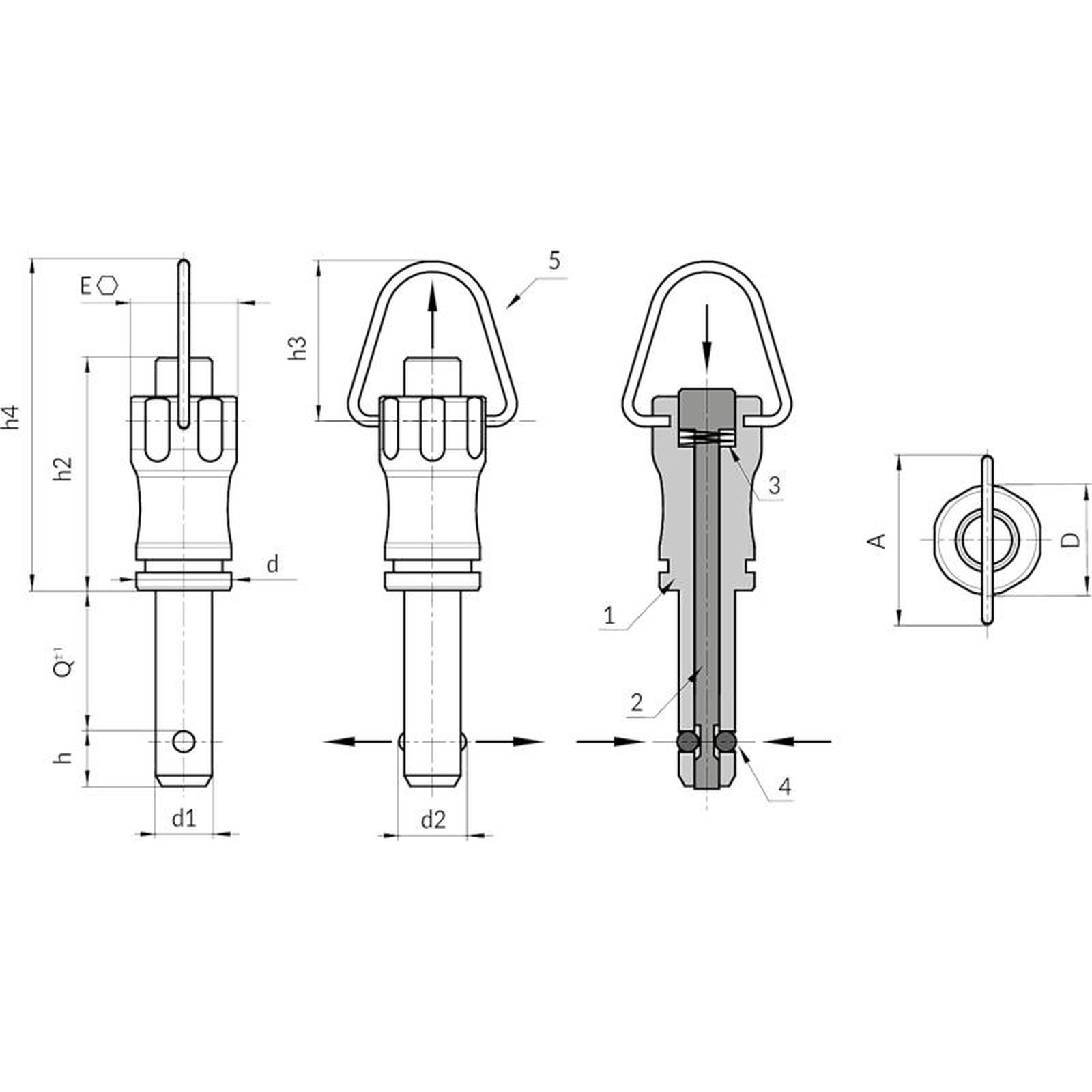 | Code | Art. | D | d | d2 | A | E | h | h2 | h3 | h4 | d1 H9 | Q (+0.6) | Weight (g) | Shear strength to double shear strength max. kN |