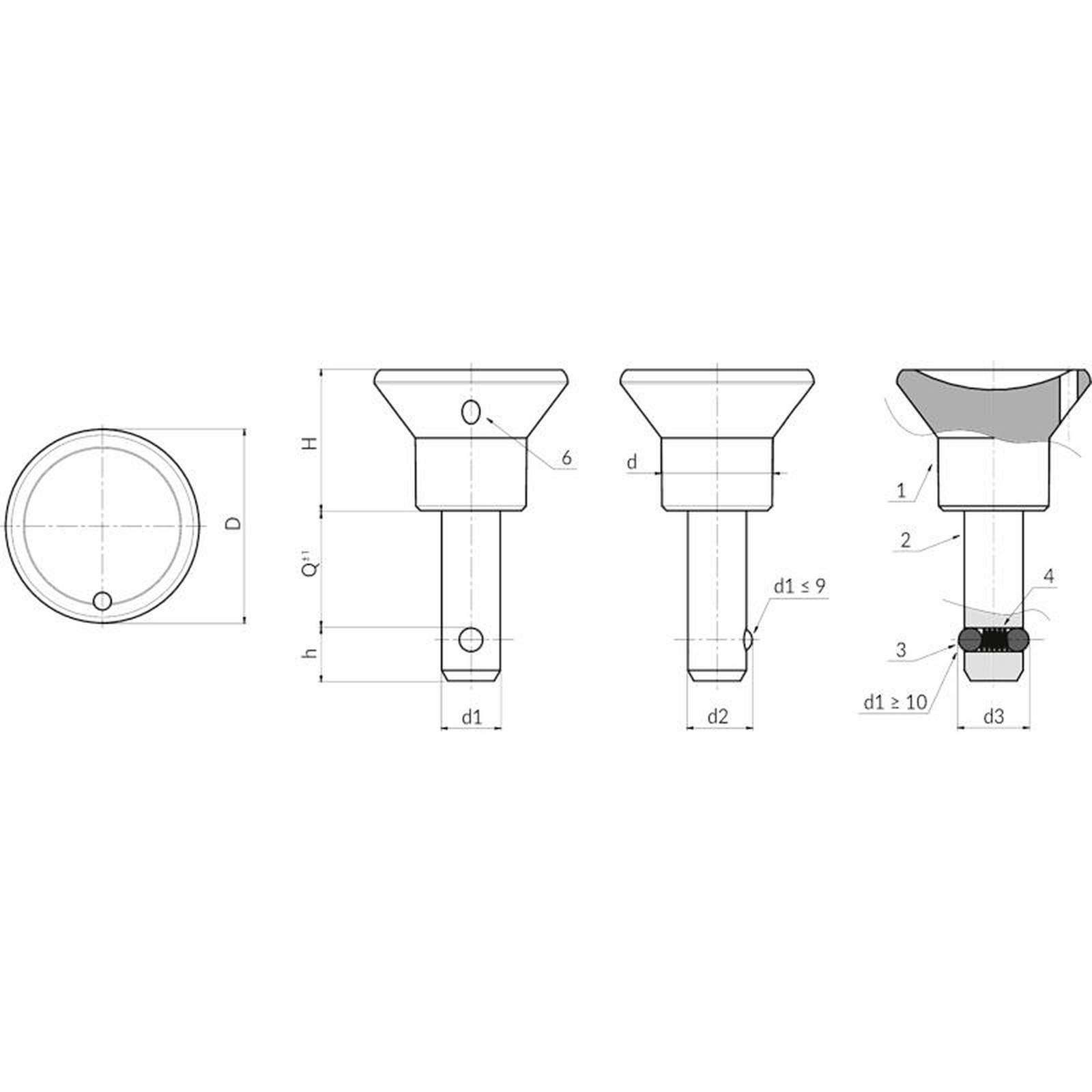| Code | Art. | D | d | H | h | d2 | d3 | d1 (-0.04 -0.08) | Q (+0.6) | Weight (g) | Shear strength to double shear strength max. kN |