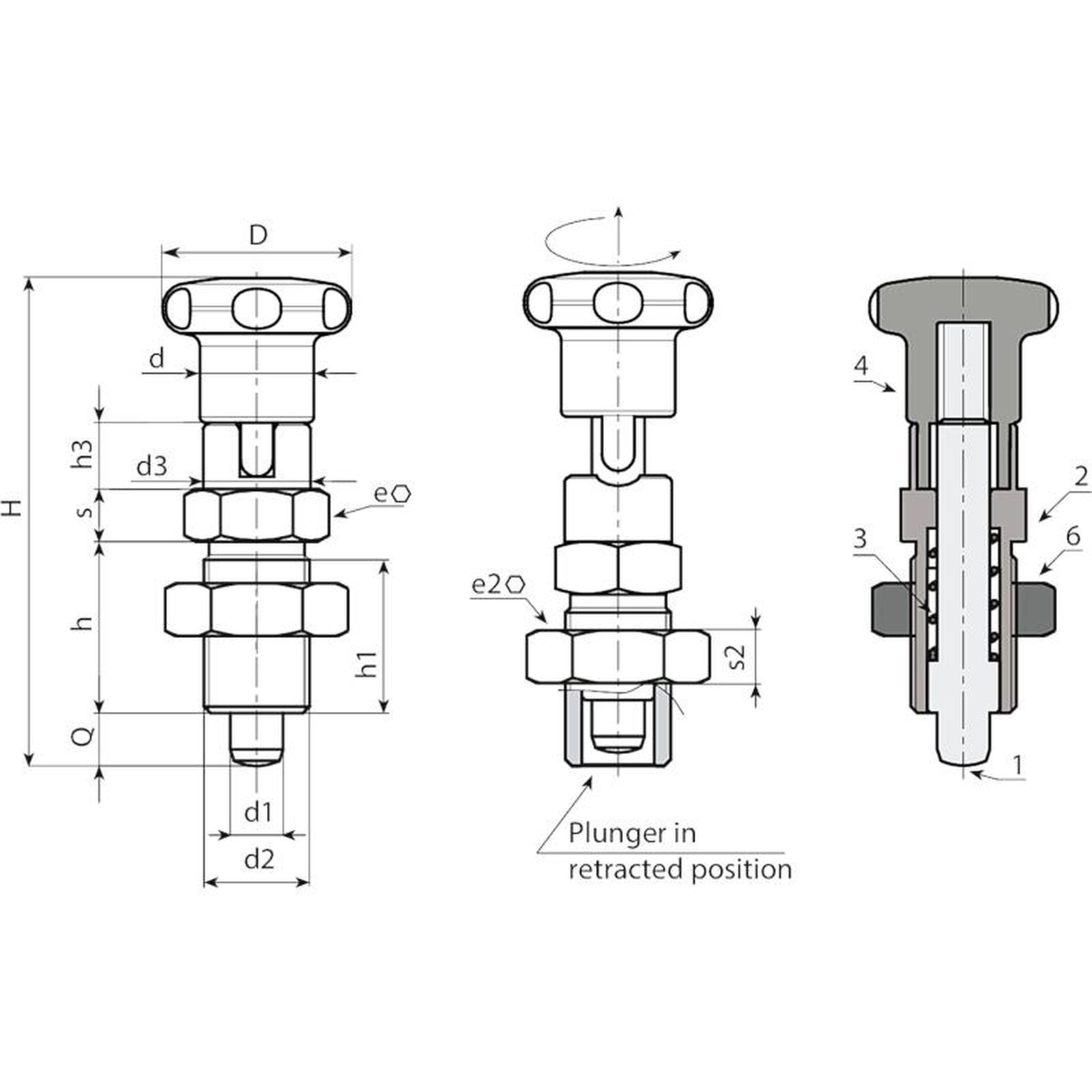 KNOB WITH LOCKING FULL STAINLESS STEEL INDEXING PLUNGER - WITH NUT